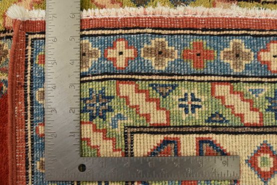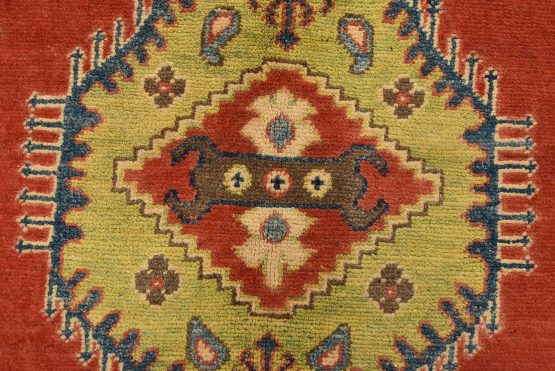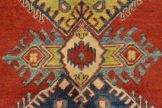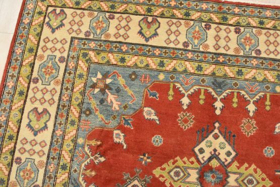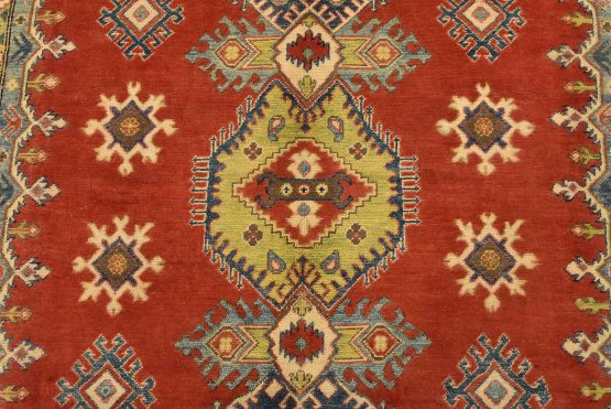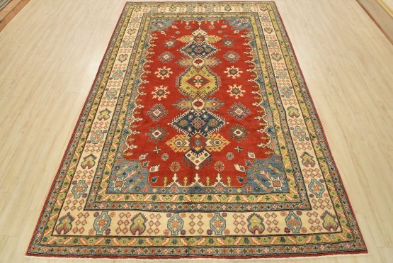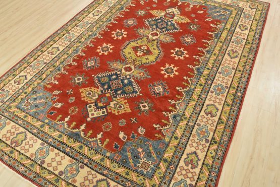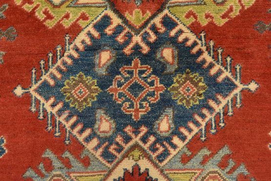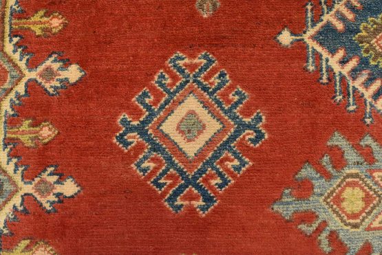 A tribal Caucasian Kazak rug hand-knotted with an all-wool pile on a cotton foundation. This oriental rug features geometric medallions surrounded by geometric motifs set against a red background. It is new and in excellent condition.