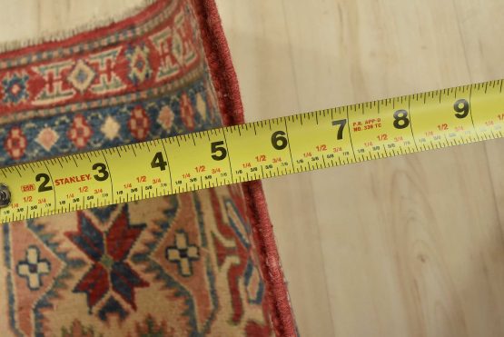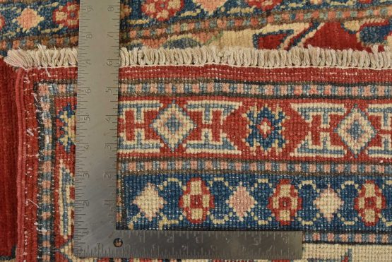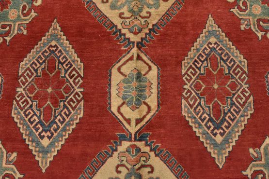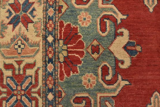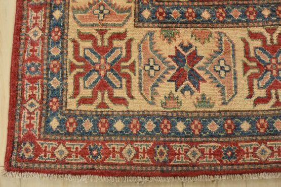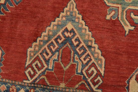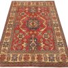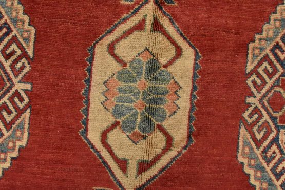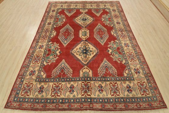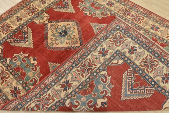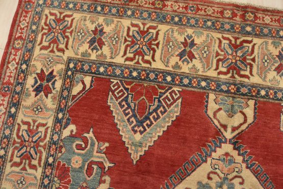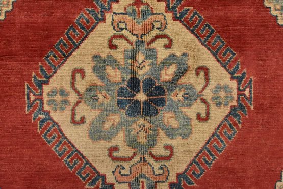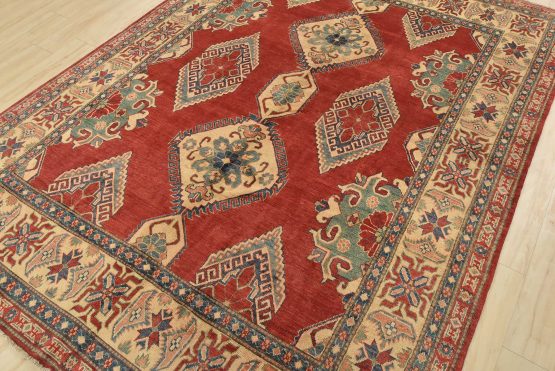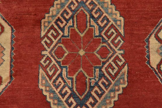 A traditional tribal Caucasian Kazak rug hand-knotted with an all-wool pile on a cotton foundation. This oriental rug features geometric medallions set against a red background. It is new and in excellent condition.