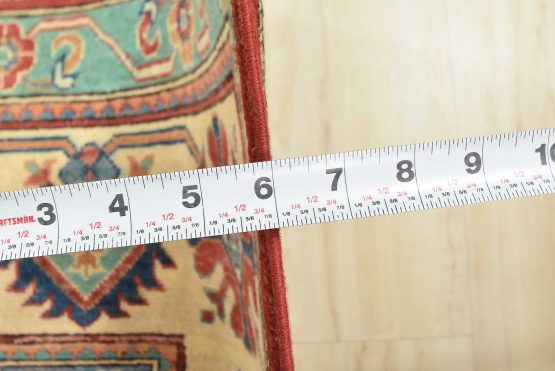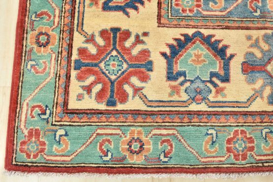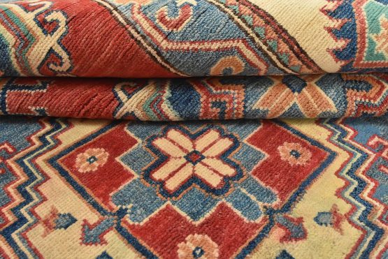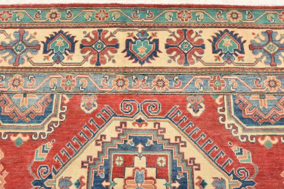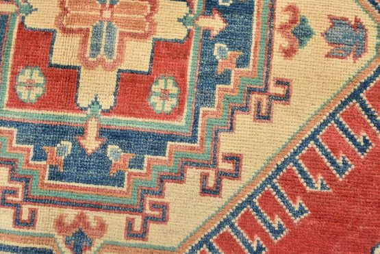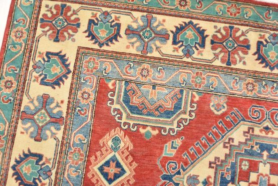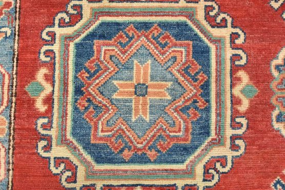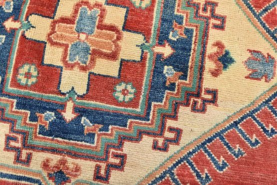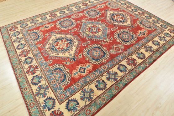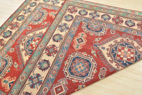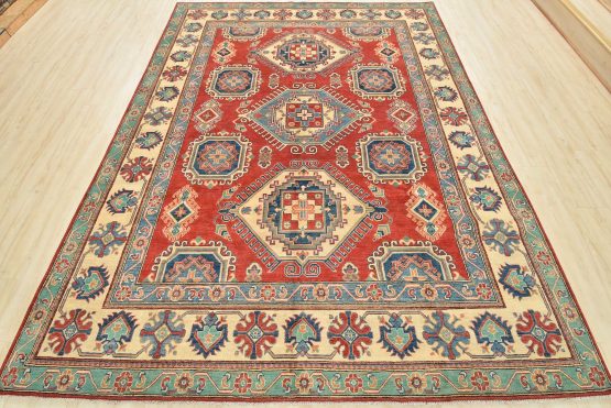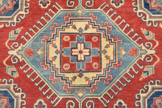 A tribal Caucasian Kazak rug hand-knotted with an all-wool pile on a cotton foundation. This oriental rug features geometric medallions surrounded by geometric motifs set against a red background. It is new and in excellent condition.