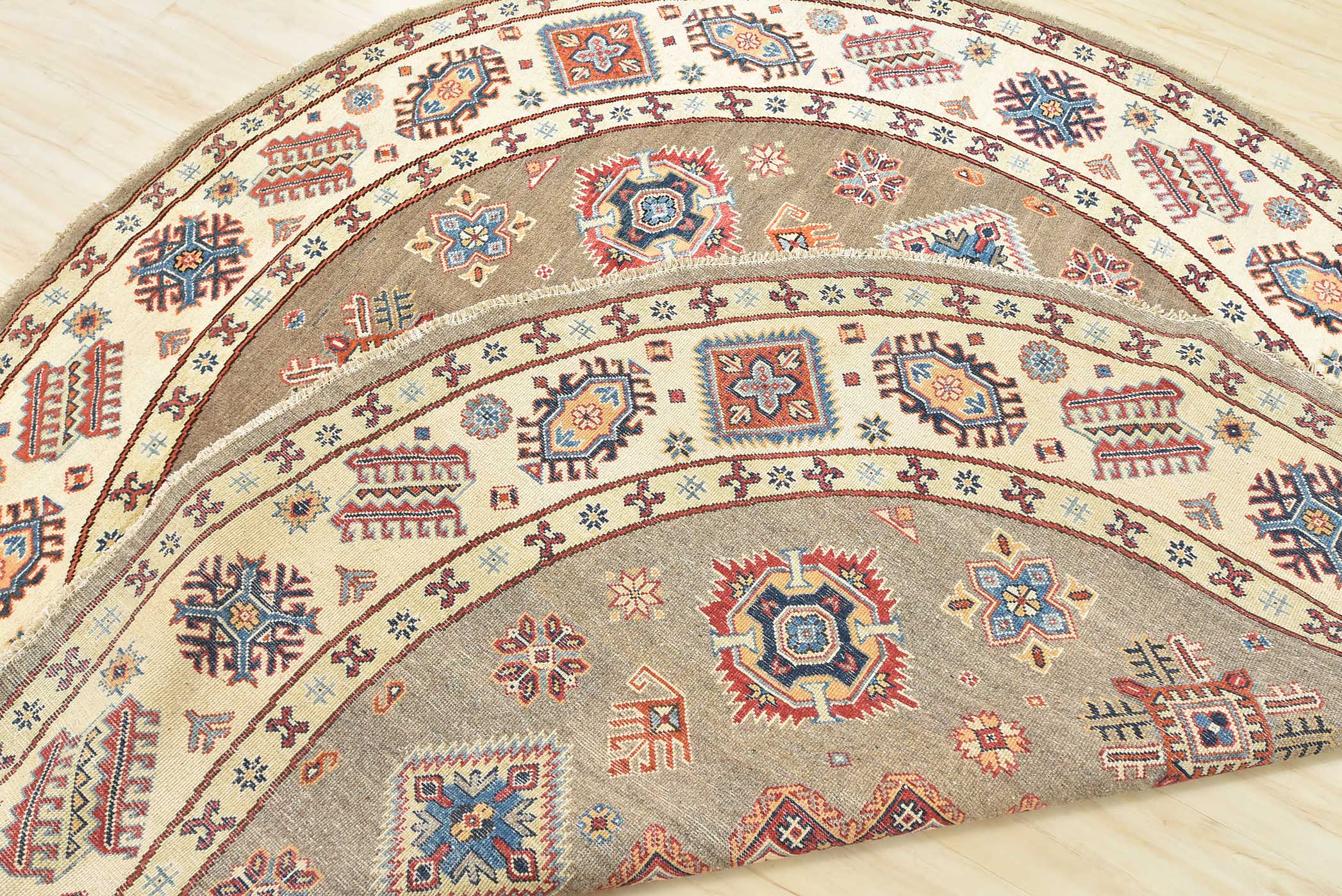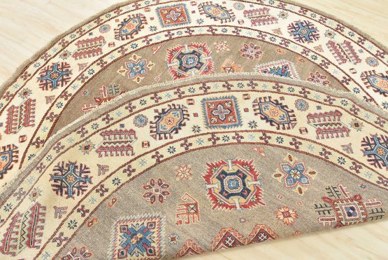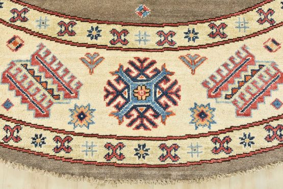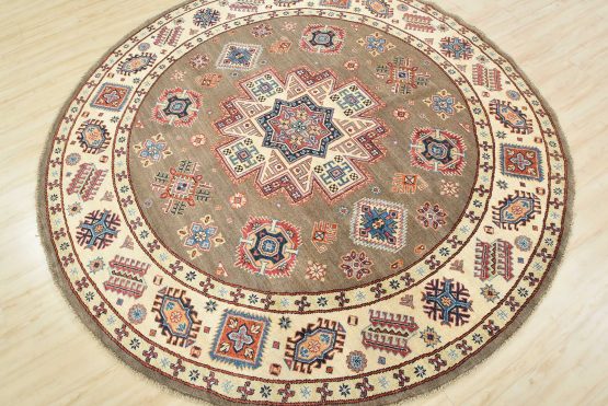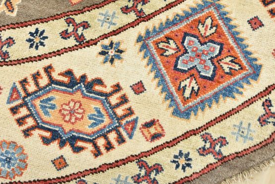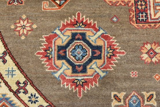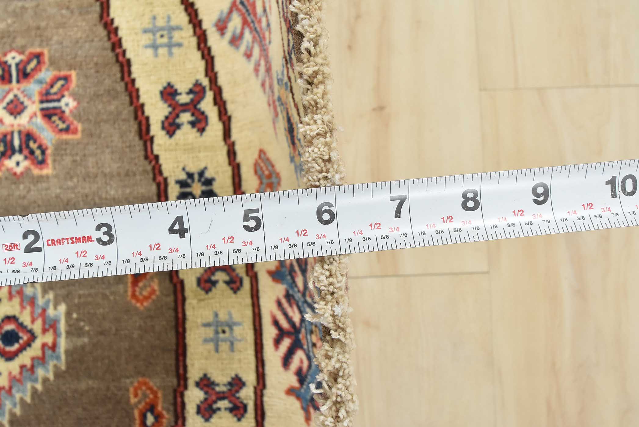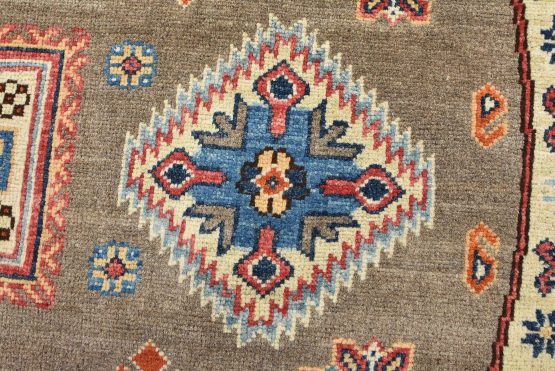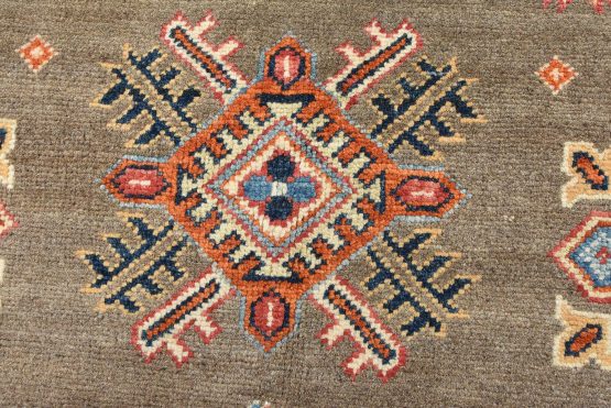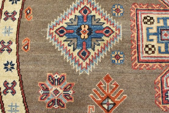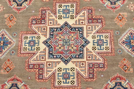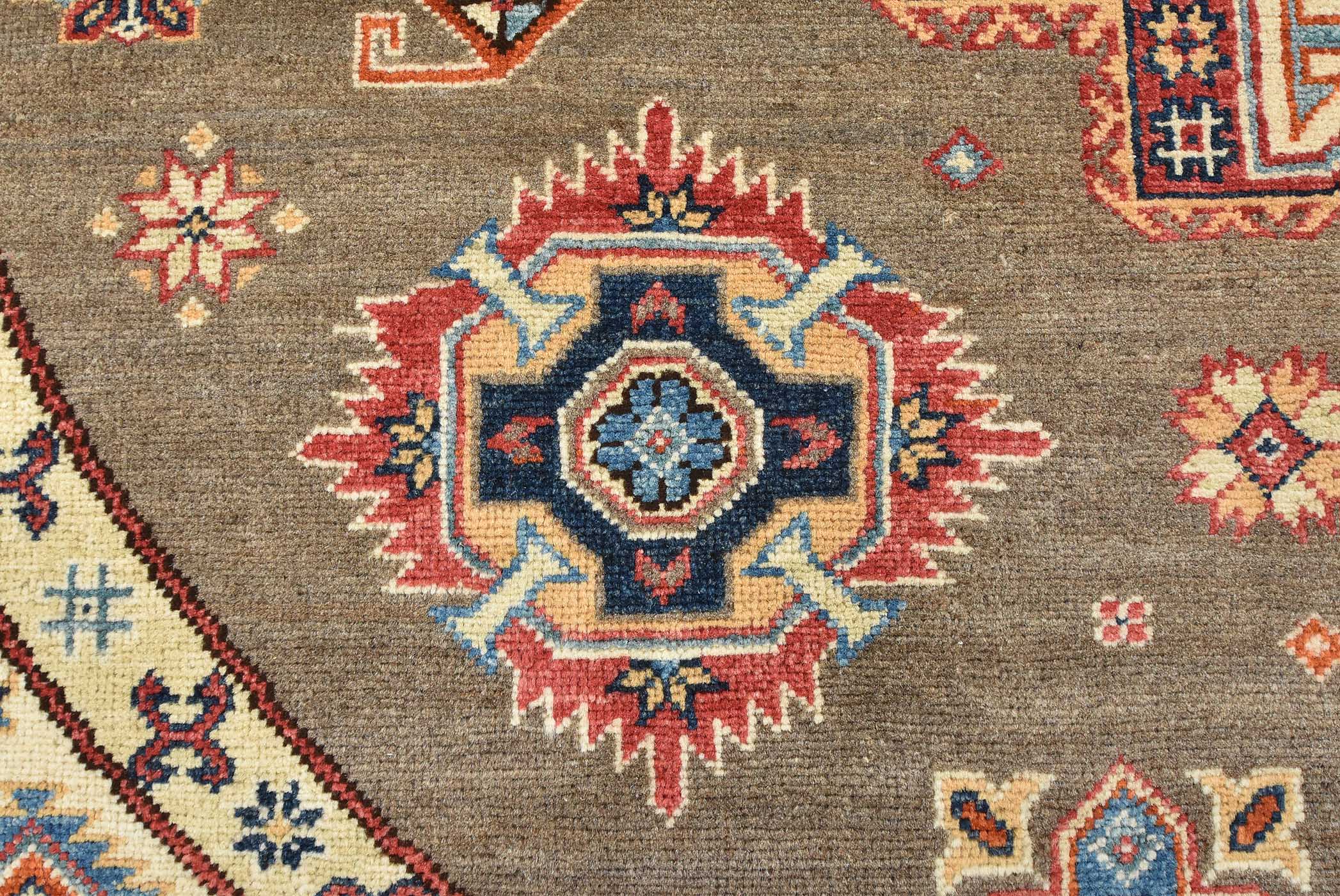 A tribal Caucasian Kazak rug hand-knotted with an all-wool pile on a cotton foundation. This oriental rug features a central geometric medallion surrounded by geometric motifs set against a brown background. It is new and in excellent condition.