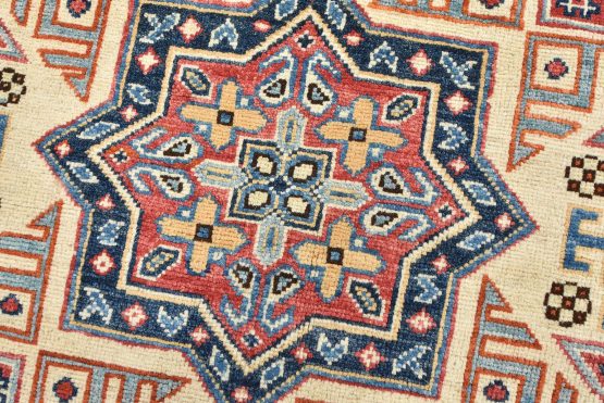 Original antique Kazak rugs from the Caucasus region inspire the creation of new Kazak rugs. These rugs are woven with fine wool using traditional Kazak patterns and finished with a low-cut pile, giving them an authentic vintage look.