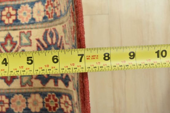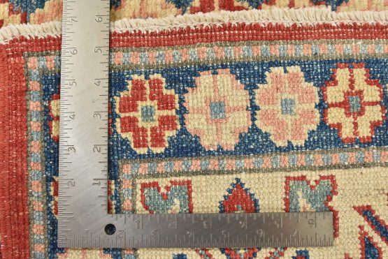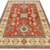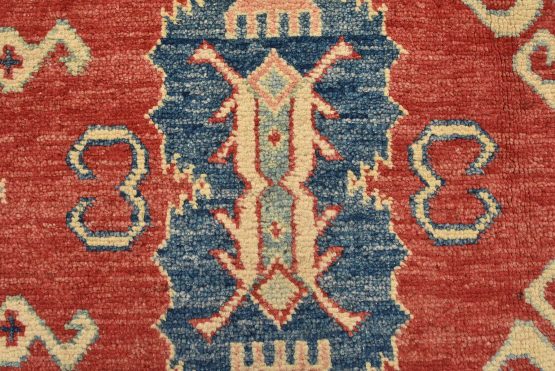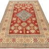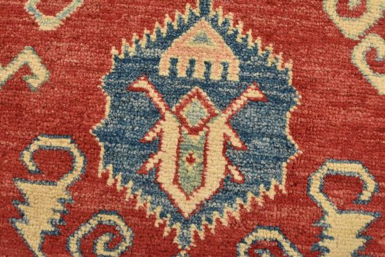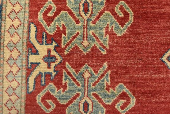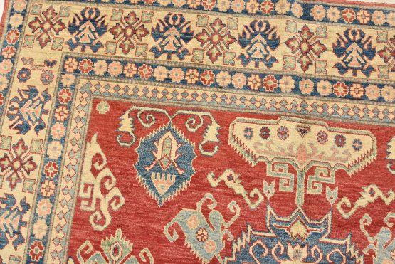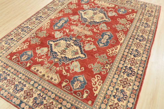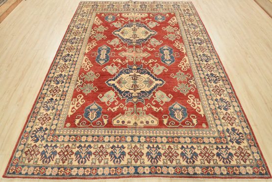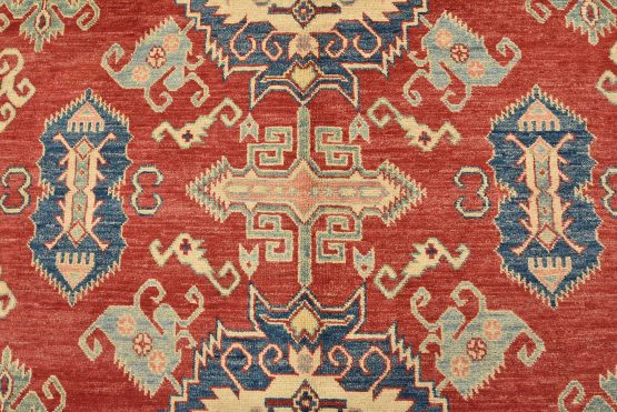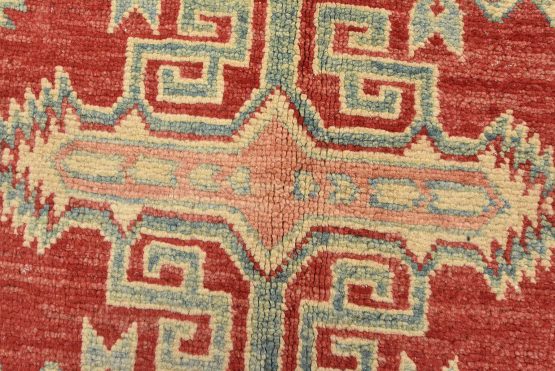 A tribal Caucasian Kazak rug hand-knotted with an all-wool pile on a cotton foundation. This oriental rug features geometric medallions surrounded by geometric motifs set against a red background. It is new and in excellent condition.