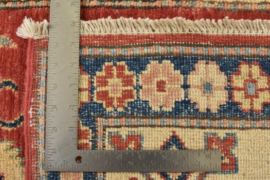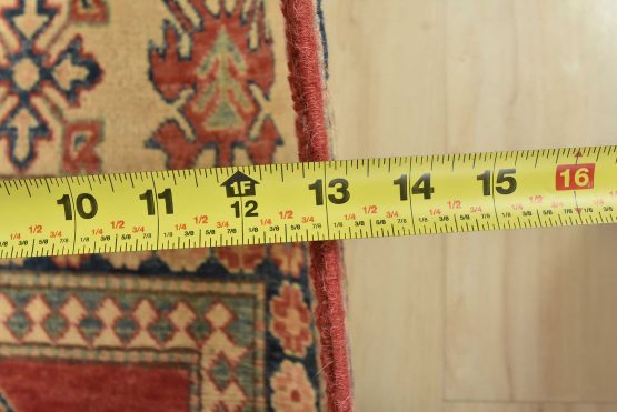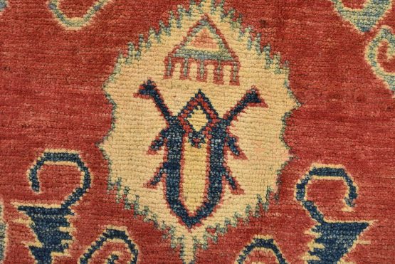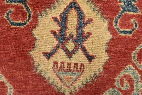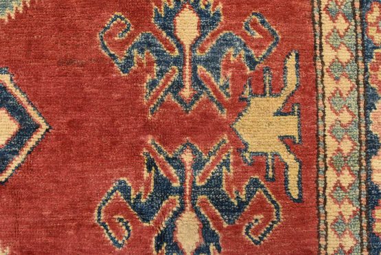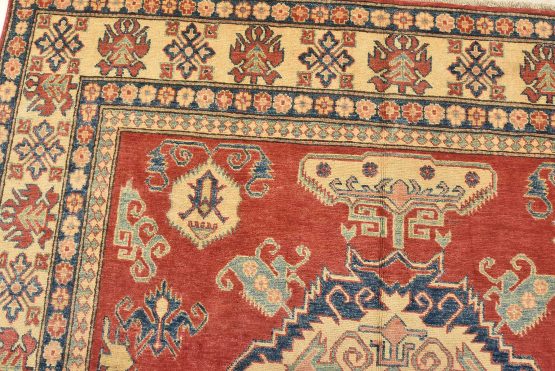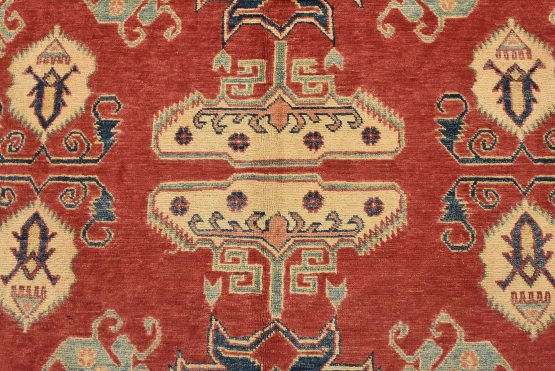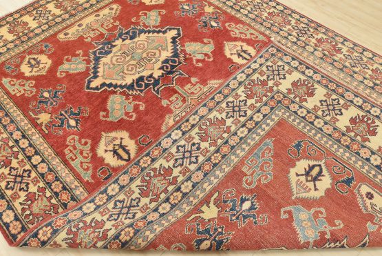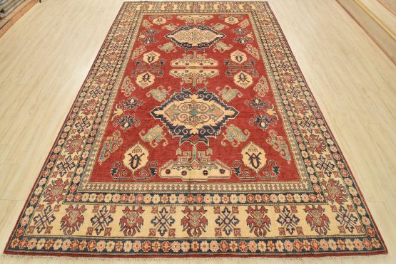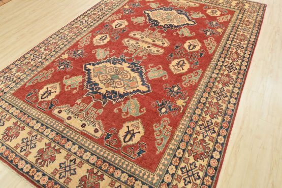 A tribal Caucasian Kazak rug hand-knotted with an all-wool pile on a cotton foundation. This oriental rug features geometric medallions surrounded by geometric motifs set against a red background. It is new and in excellent condition.