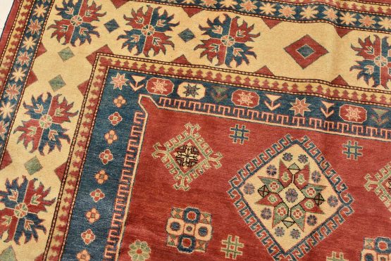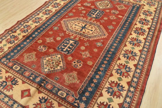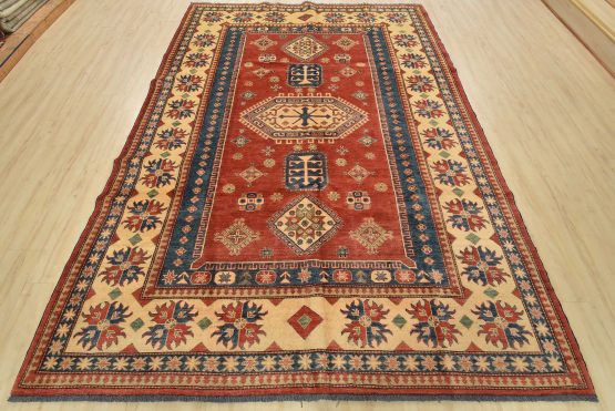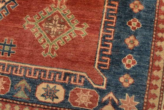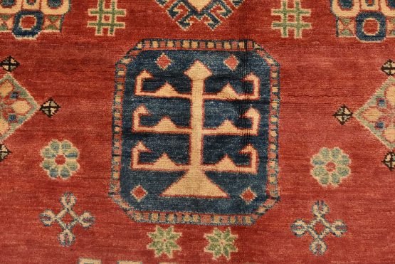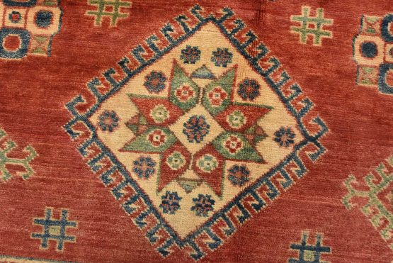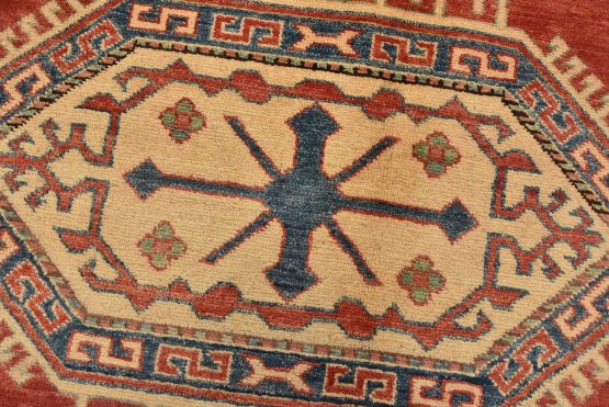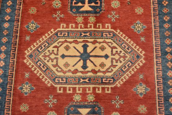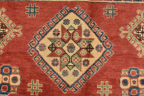 A tribal Caucasian Kazak rug hand-knotted with an all-wool pile on a cotton foundation. This oriental rug features a central geometric medallion surrounded by geometric motifs set against a red background. It is new and in excellent condition.