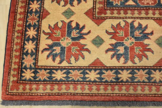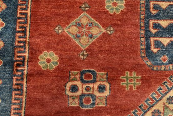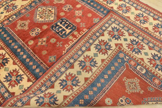 Original antique Kazak rugs from the Caucasus region inspire the creation of Kazak rugs. These rugs are woven with fine wool using traditional Kazak patterns and finished with a low-cut pile to give them an authentic vintage look.