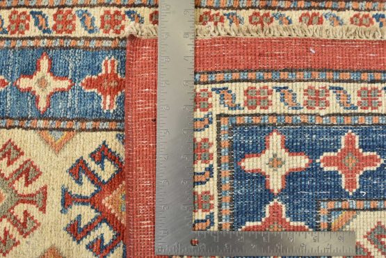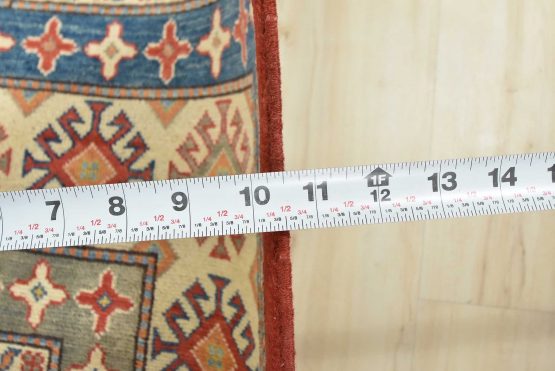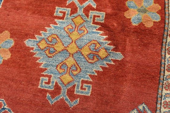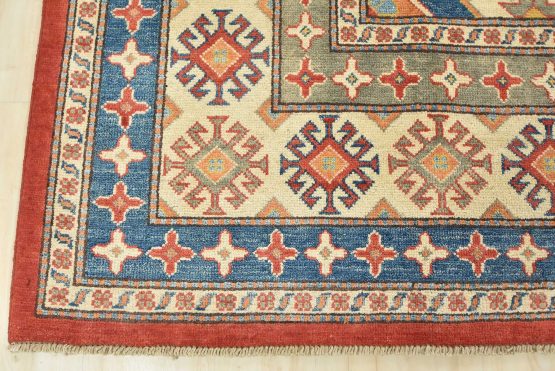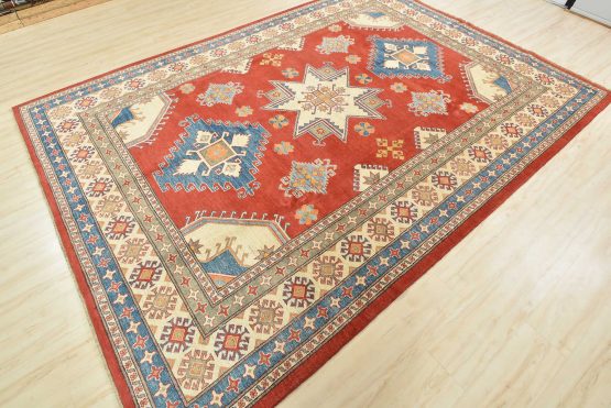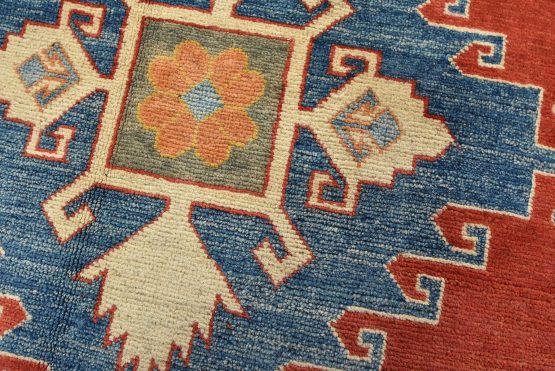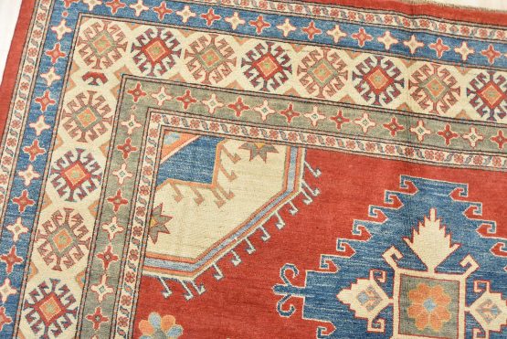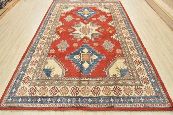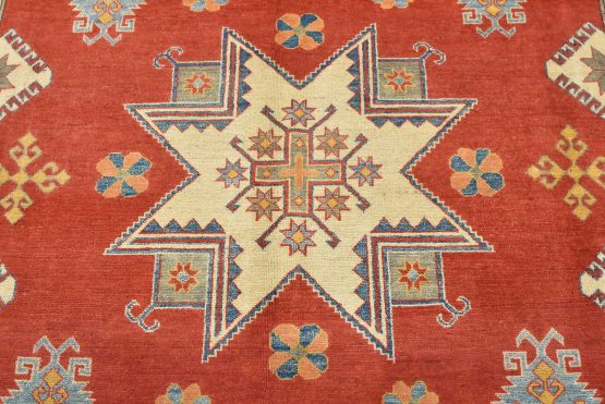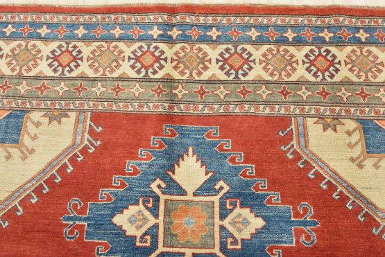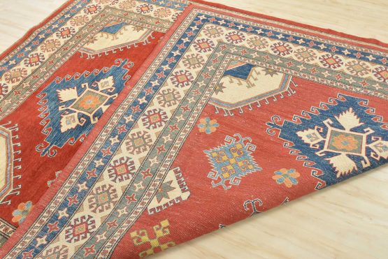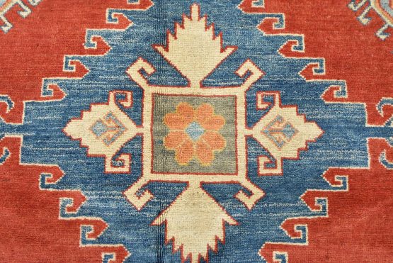 A tribal Caucasian Kazak rug hand-knotted with an all-wool pile on a cotton foundation. This oriental rug features geometric medallions surrounded by geometric motifs set against a red background. It is new and in excellent condition.