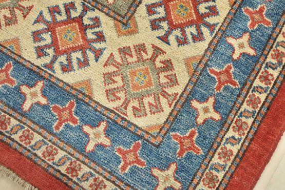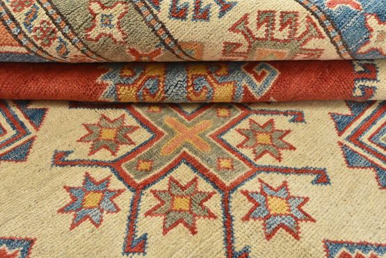 Original antique Kazak rugs from the Caucasus region inspire the creation of new Kazak rugs. These rugs are woven with fine wool using traditional Kazak patterns and finished with a low-cut pile to give them an authentic vintage look.