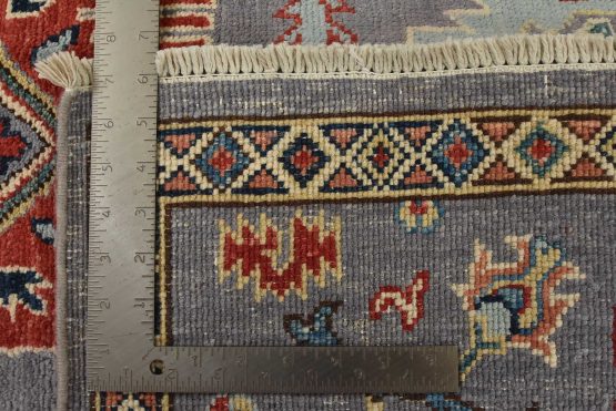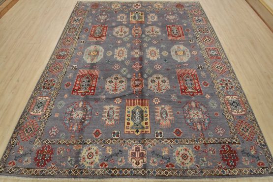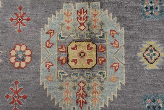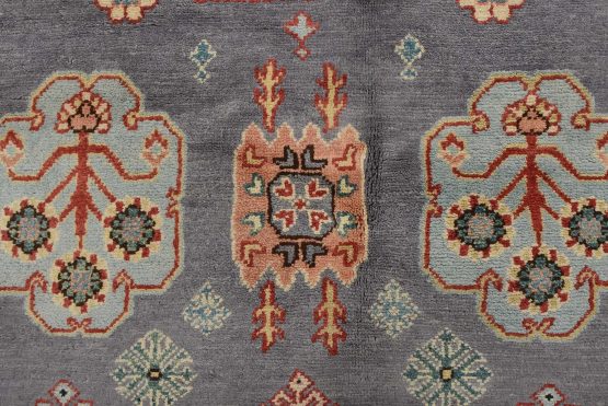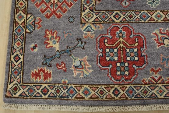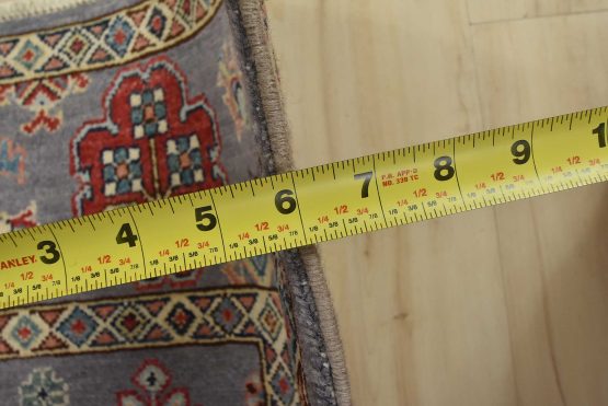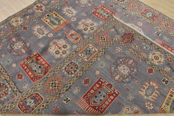 A tribal Caucasian Kazak rug hand-knotted with an all-wool pile on a cotton foundation. This oriental rug features rows of geometric motifs set against a light purple background. It is new and in excellent condition.