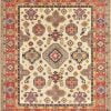A traditional tribal Caucasian Kazak rug hand-knotted with an all-wool pile on a cotton foundation. This oriental rug features a central medallion surrounded by geometric motifs set against a red background. It is new and in excellent condition.