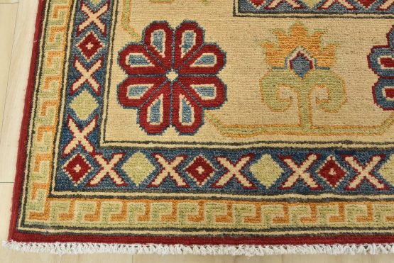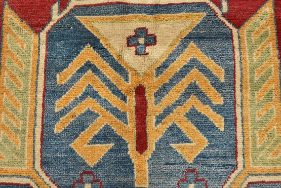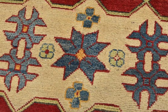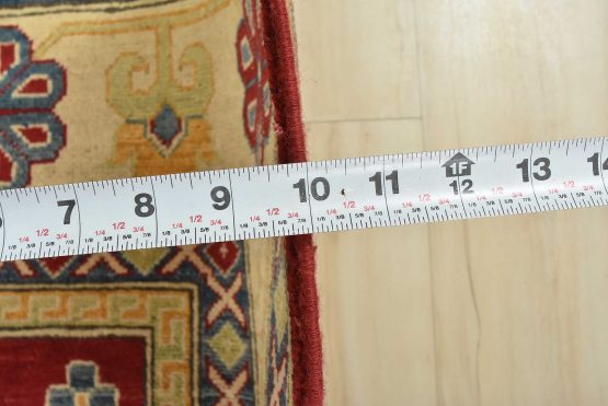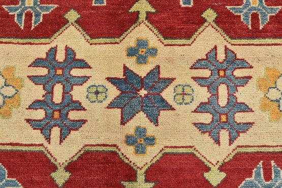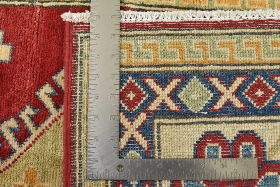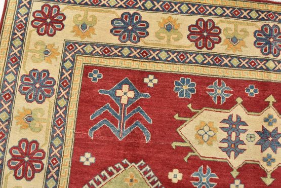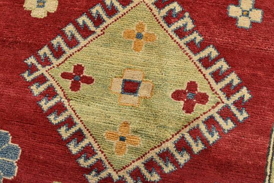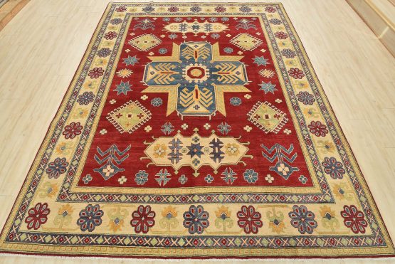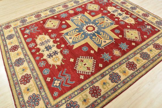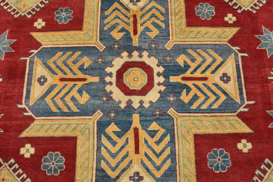 A tribal Caucasian Kazak rug hand-knotted with an all-wool pile on a cotton foundation. This oriental rug features a central geometric medallion surrounded by geometric motifs set against a red background. It is new and in excellent condition.