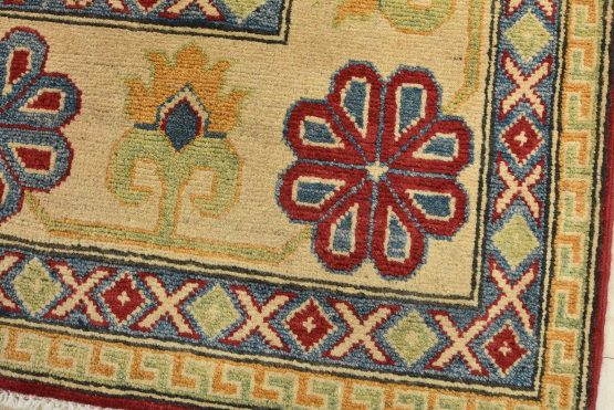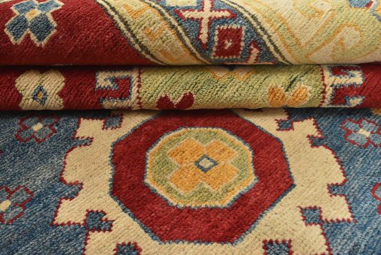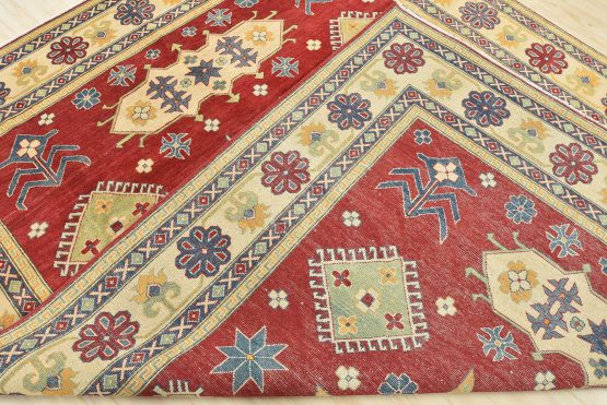 Original antique Kazak rugs from the Caucasus region inspire the creation of new Kazak rugs. These rugs are woven with fine wool using traditional Kazak patterns and finished with a low-cut pile to give them an authentic vintage look.
