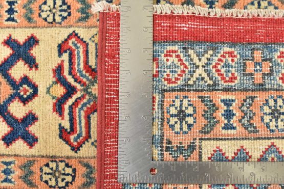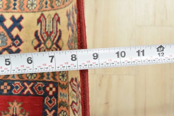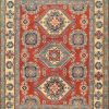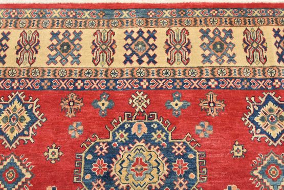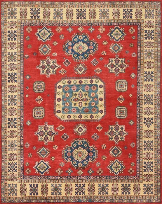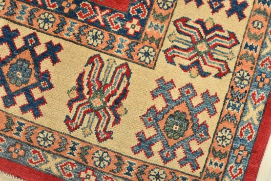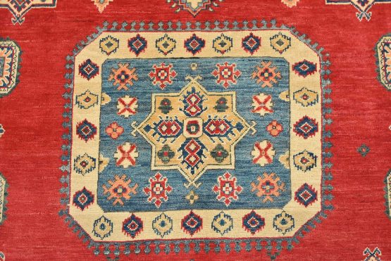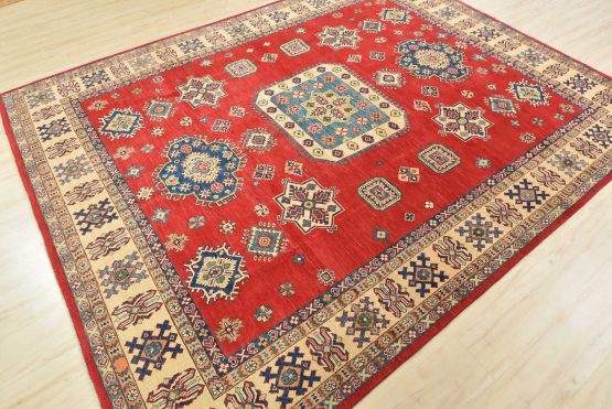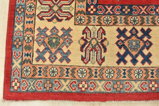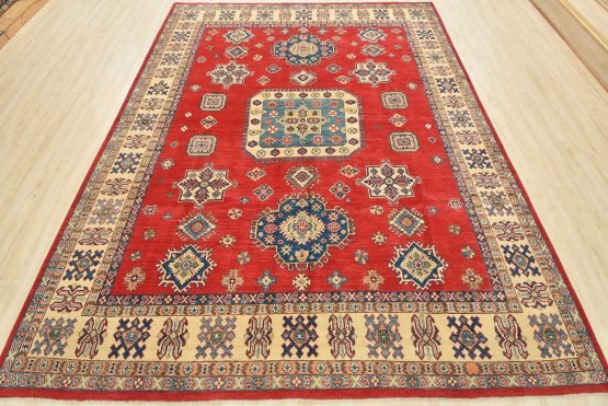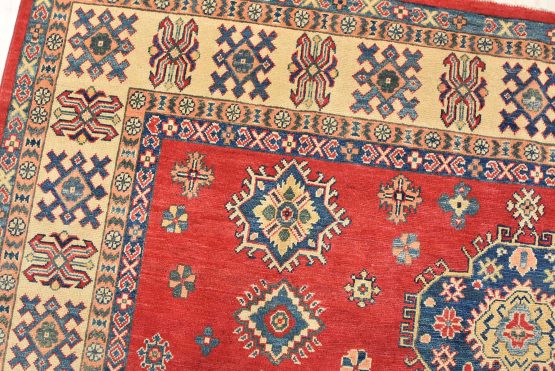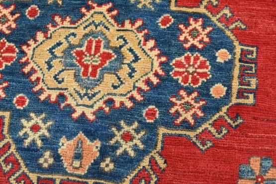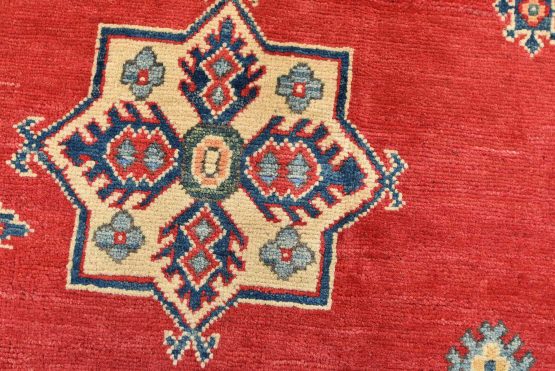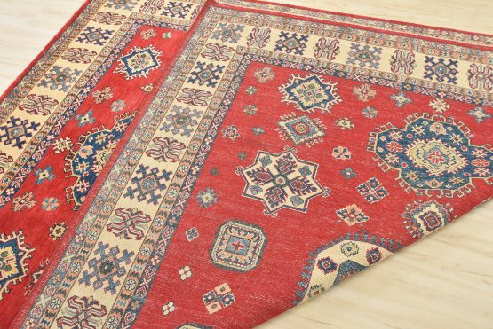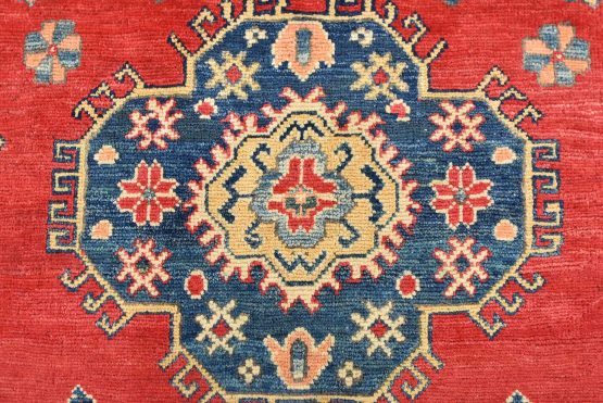 A tribal Caucasian Kazak rug hand-knotted with an all-wool pile on a cotton foundation. This oriental rug features a central geometric medallion surrounded by geometric motifs set against a red background. It is new and in excellent condition.