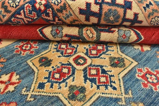 Original antique Kazak rugs from the Caucasus region inspire the creation of new Kazak rugs. These rugs are woven with fine wool using traditional Kazak patterns and finished with a low-cut pile to give them an authentic vintage look.