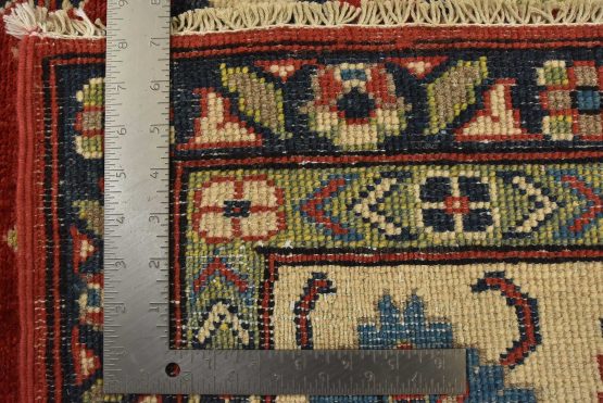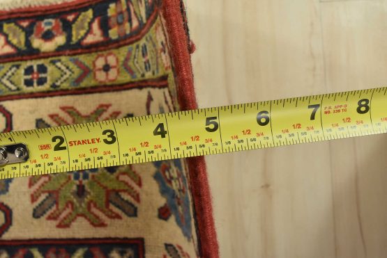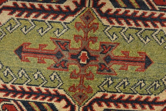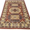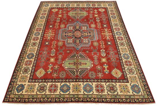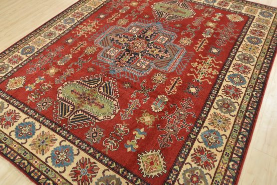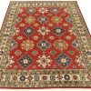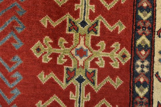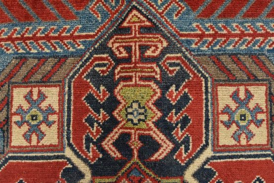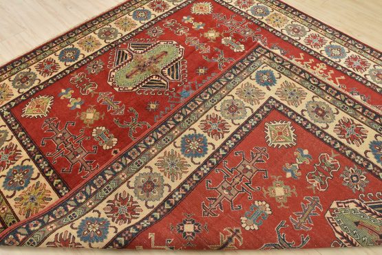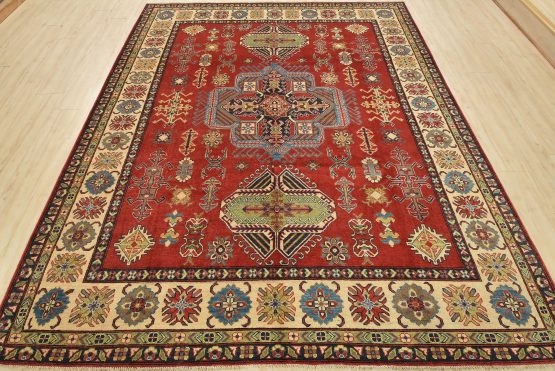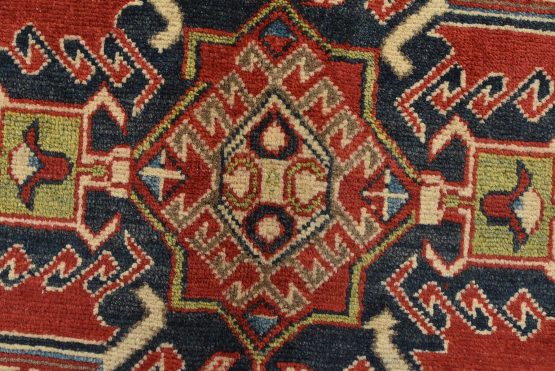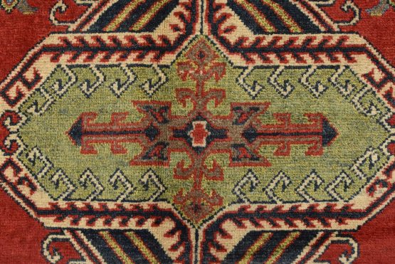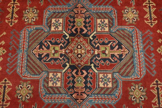 A tribal Caucasian Kazak rug hand-knotted with an all-wool pile on a cotton foundation. This oriental rug features geometric medallions surrounded by small geometric motifs set against a red background. It is new and in excellent condition.
