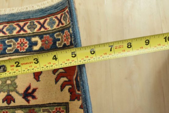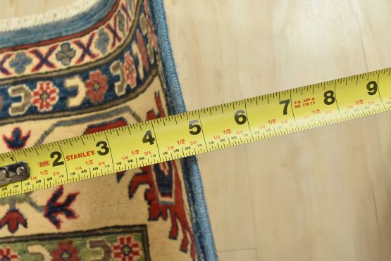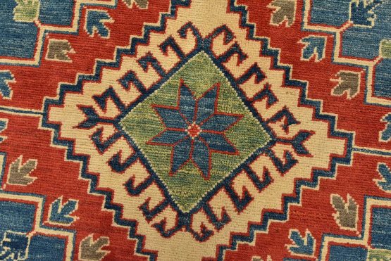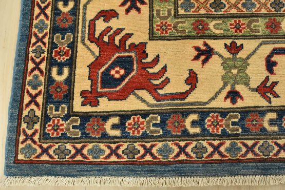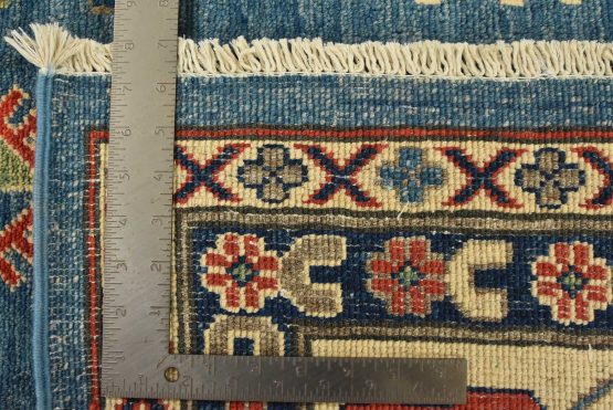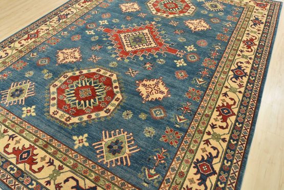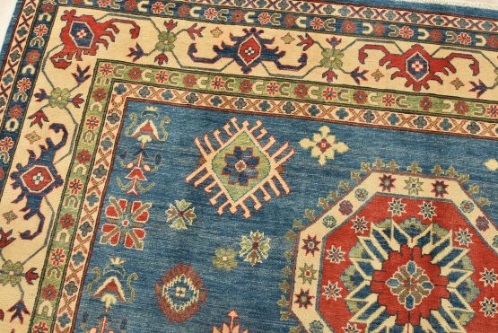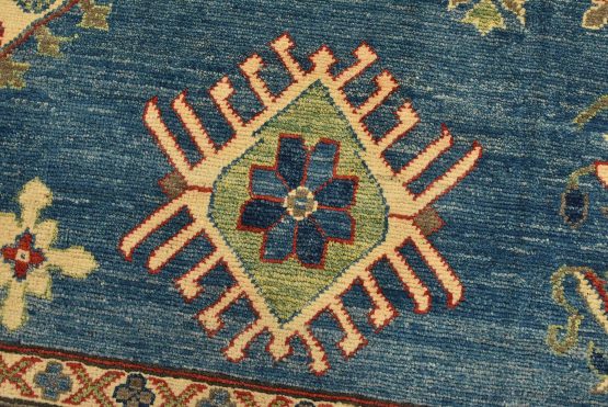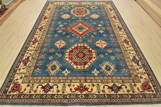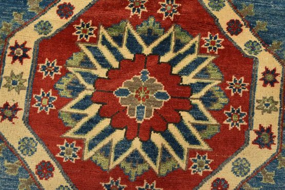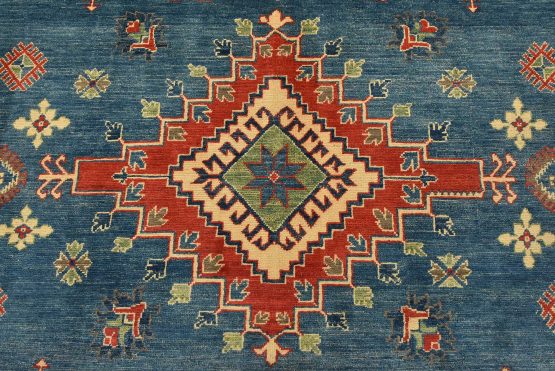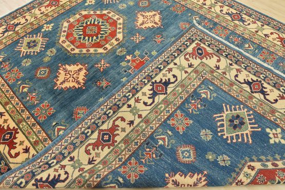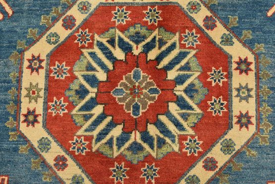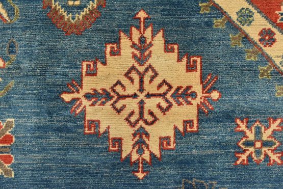 A traditional tribal Caucasian Kazak rug hand-knotted with an all-wool pile on a cotton foundation. This oriental rug features geometric medallions surrounded by geometric motifs set against a blue background. It is new and in excellent condition.