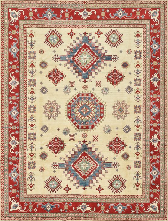 Original antique Kazak rugs from the Caucasus region inspire the creation of new Kazak rugs. These rugs are woven with fine wool using traditional Kazak patterns and finished with a low-cut pile to give them an authentic vintage look.