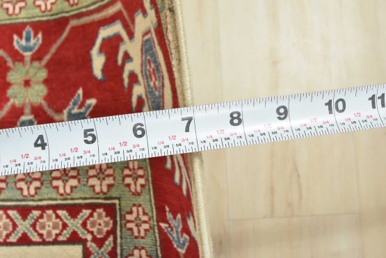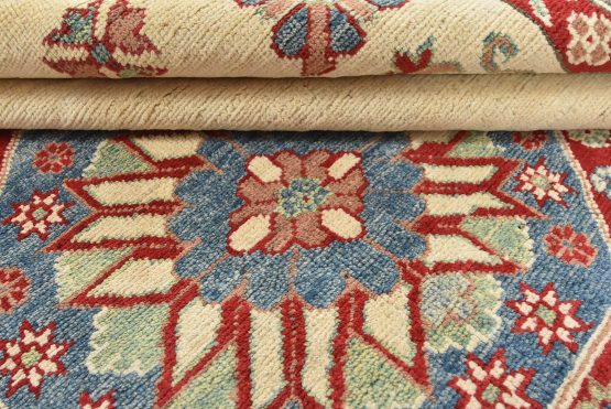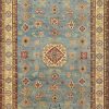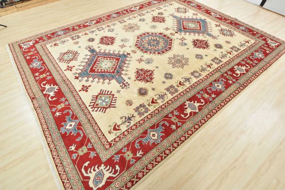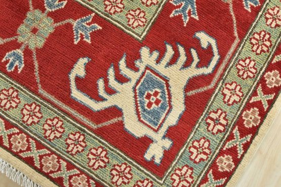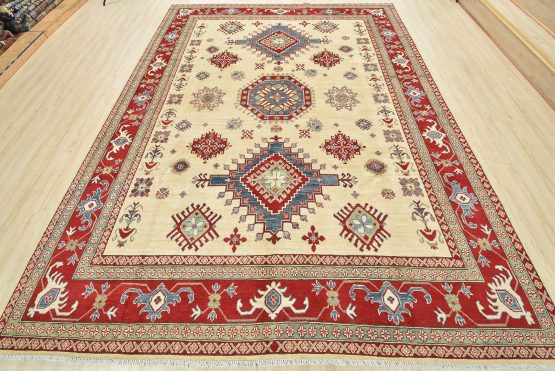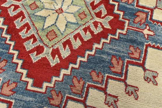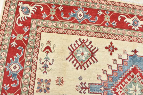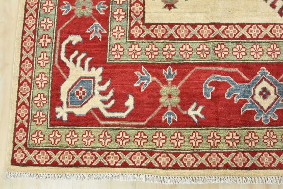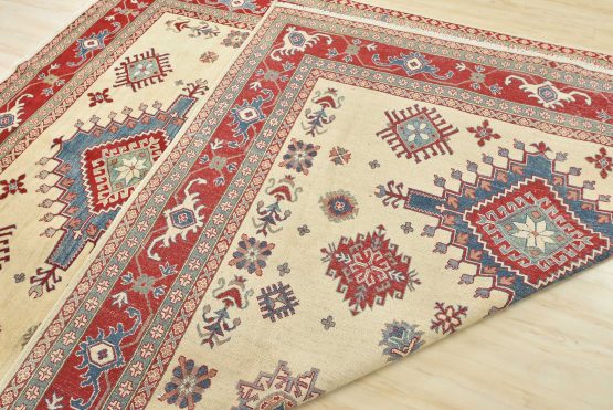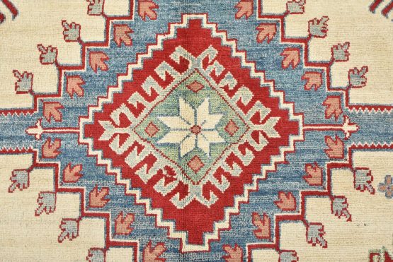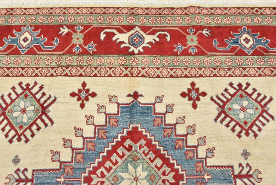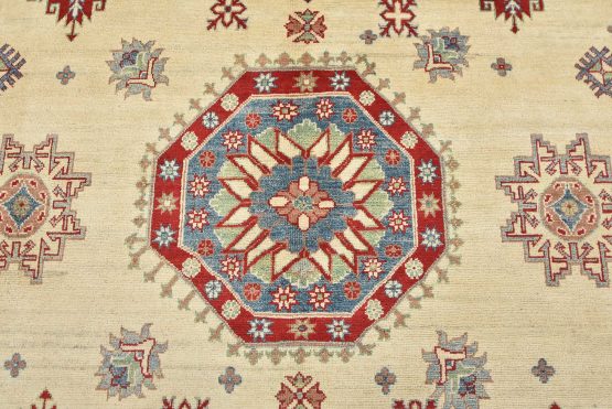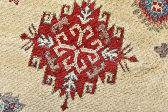 A tribal Caucasian Kazak rug hand-knotted with an all-wool pile on a cotton foundation. This oriental rug features geometric medallions surrounded by geometric motifs set against a beige background. It is new and in excellent condition.