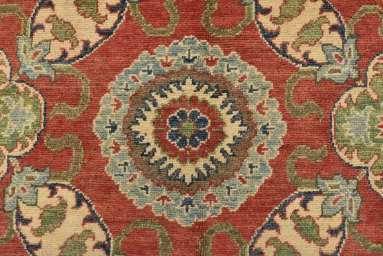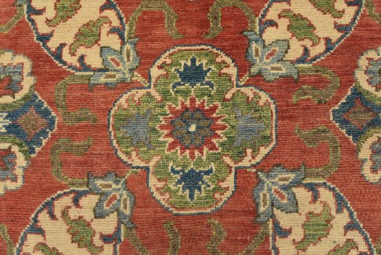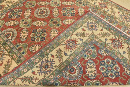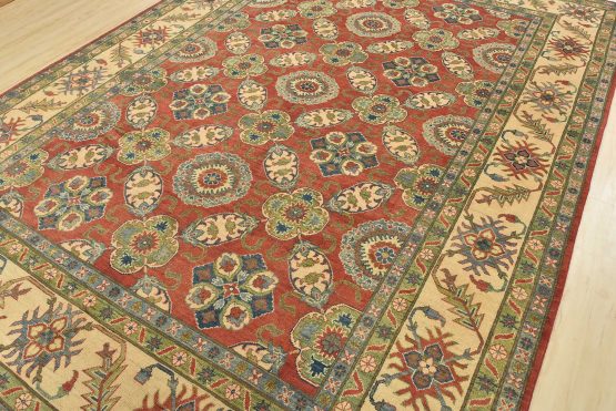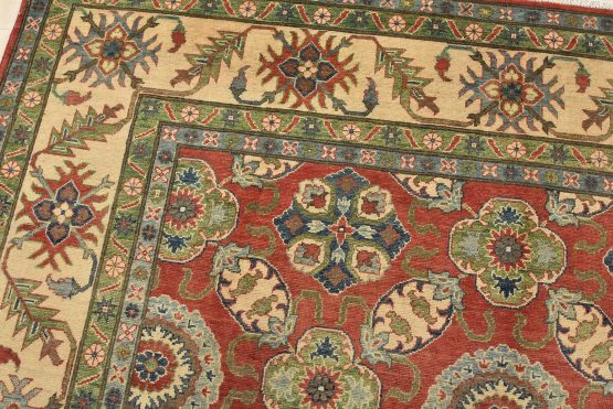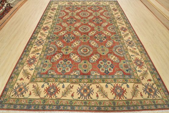 A traditional Caucasian Kazak rug hand-knotted with an all-wool pile on a cotton foundation. This oriental rug features an all-over design of botanical motifs set against a red background. It is new and in excellent condition.