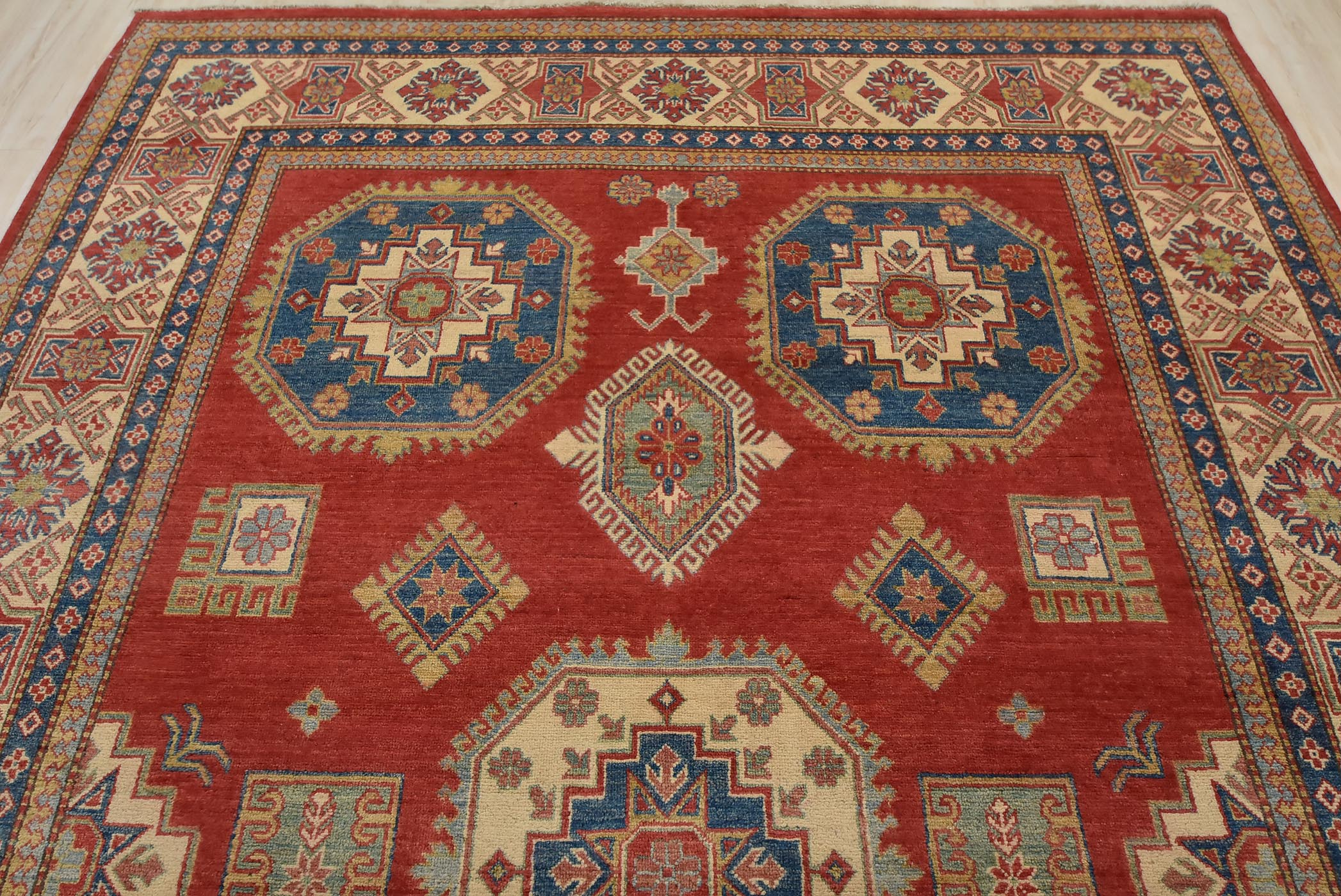 A tribal Caucasian Kazak rug hand-knotted with an all-wool pile on a cotton foundation. This oriental rug features geometric medallions surrounded by geometric medallions set against a red background. It is new and in excellent condition.