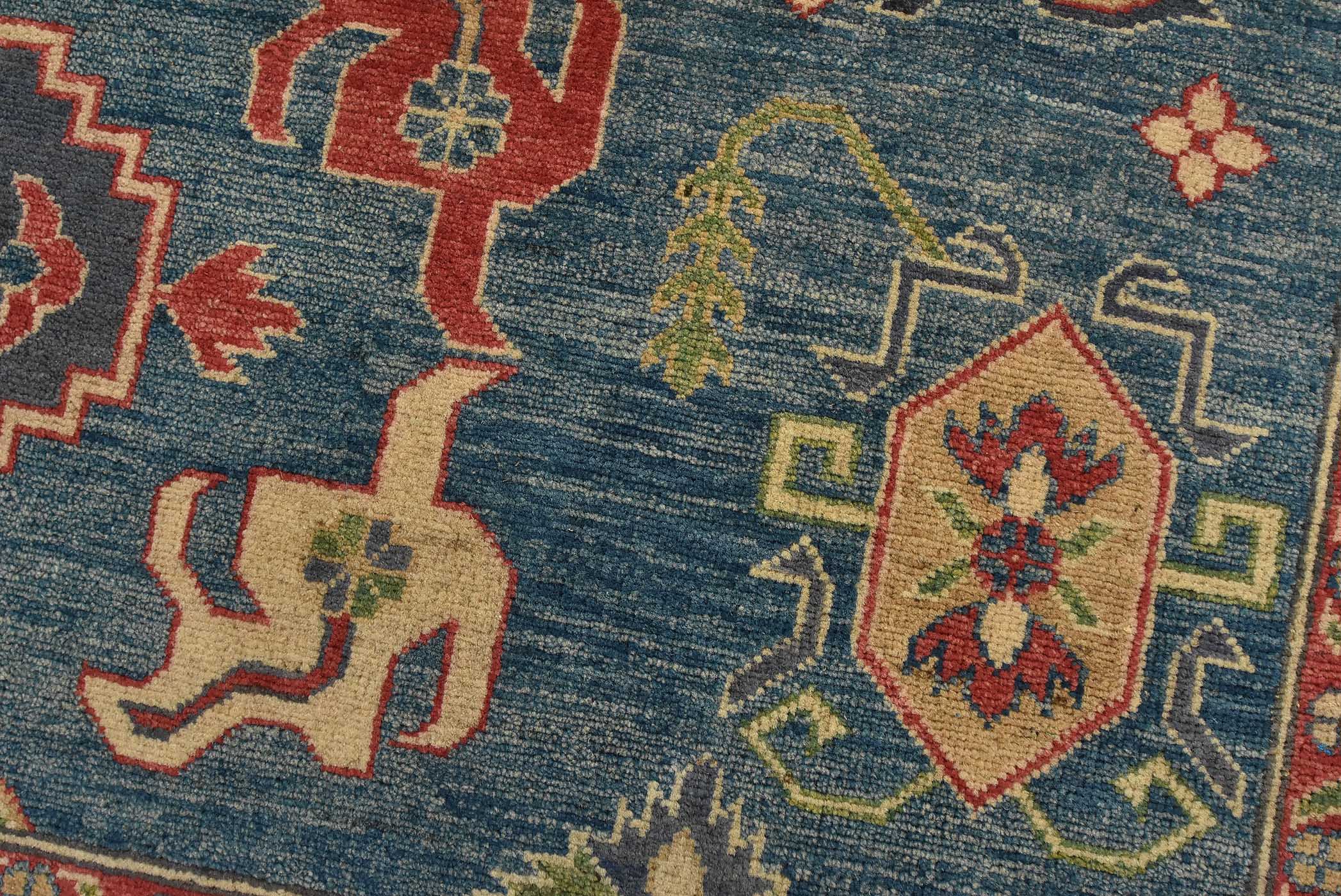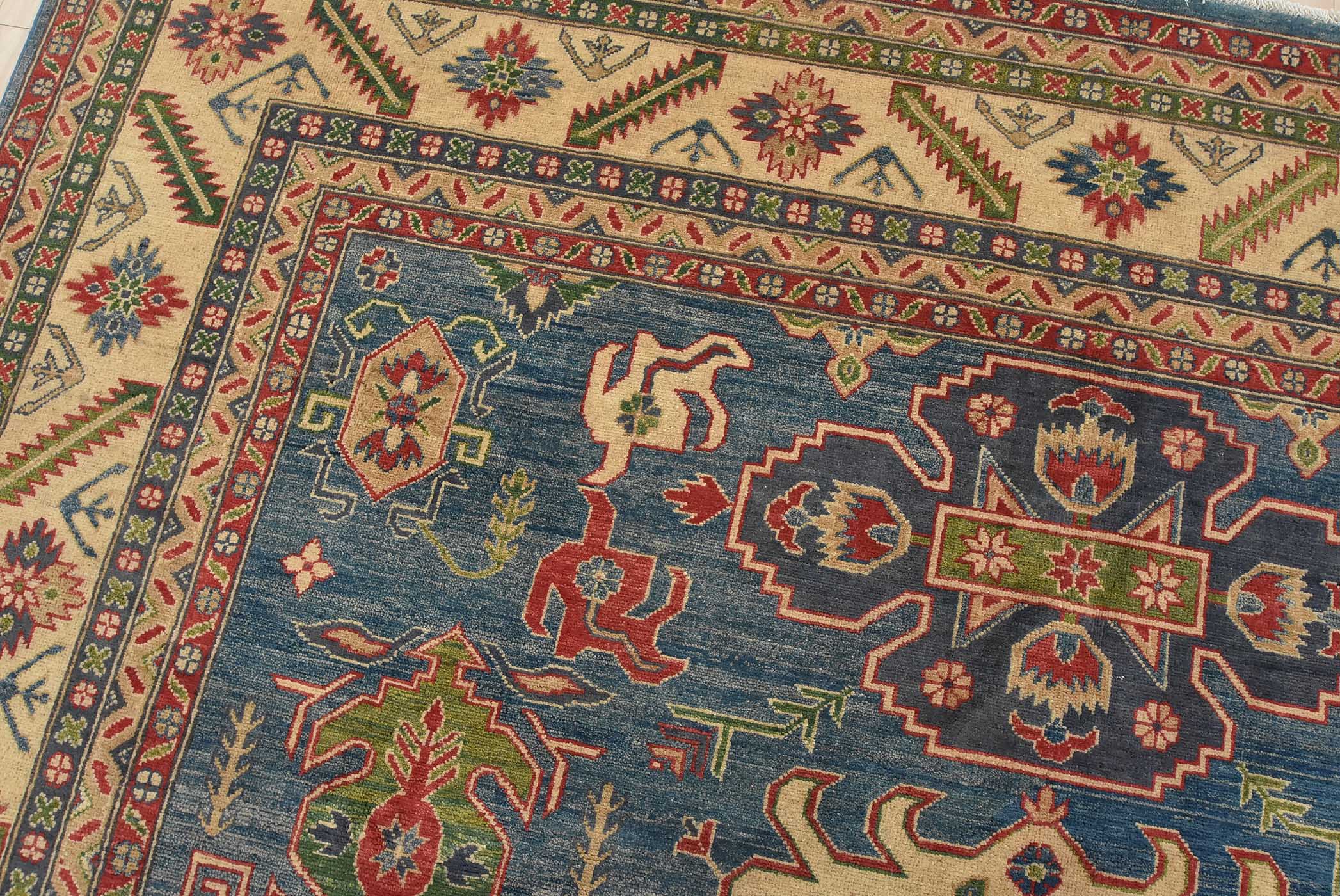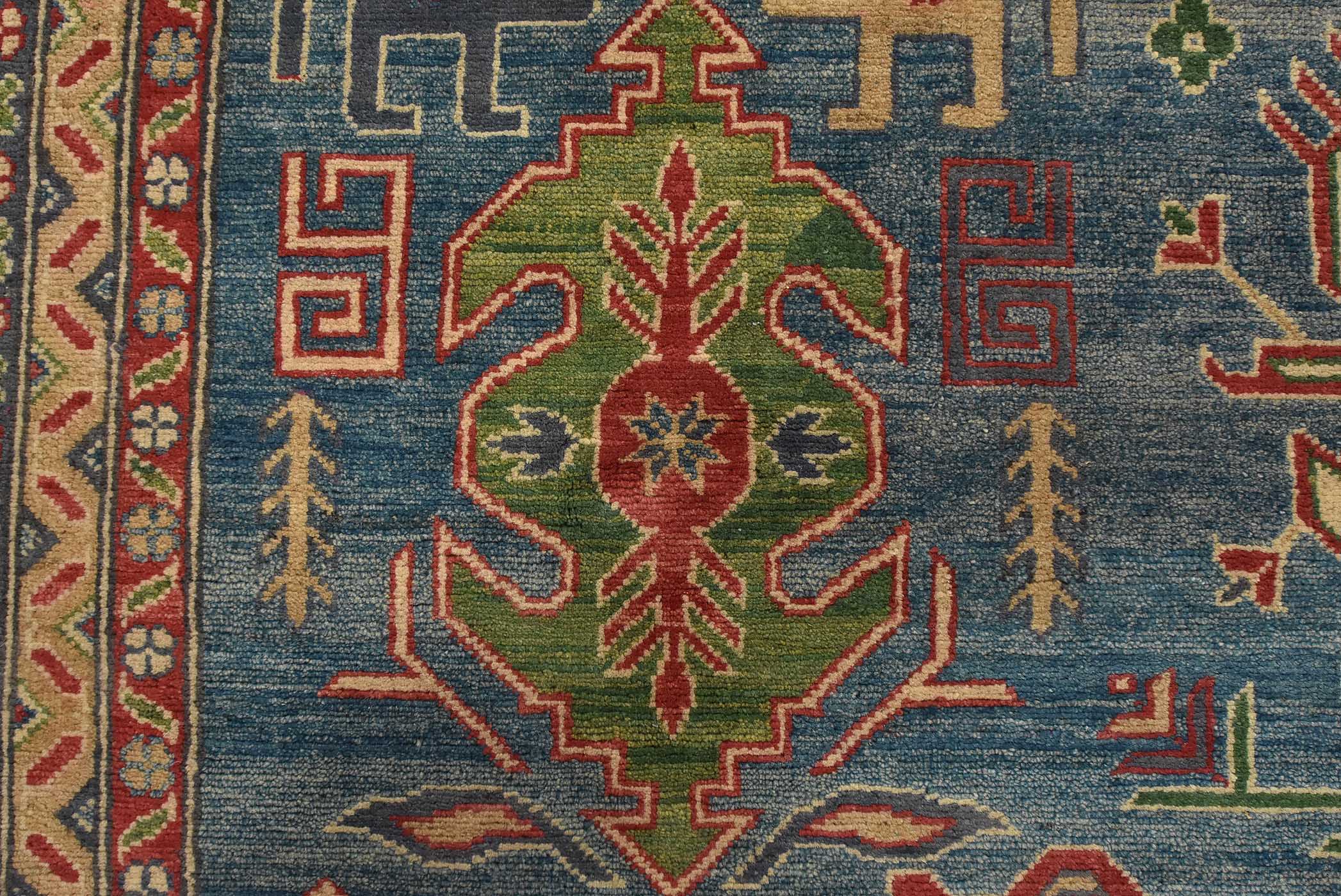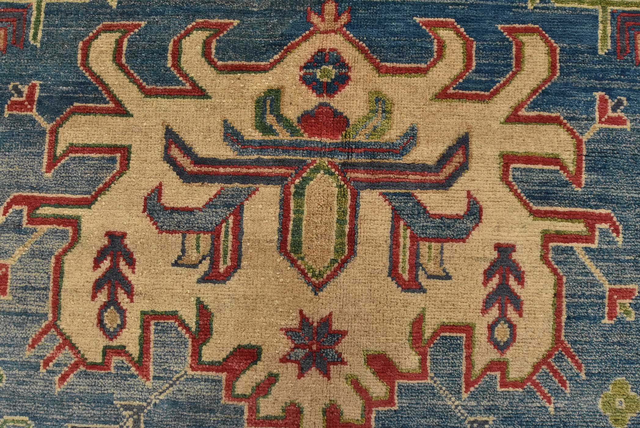 A tribal Caucasian Kazak rug hand-knotted with fine wool on a cotton foundation. This oriental rug features a central medallion surrounded by geometric motifs set against a blue background. It is new and in excellent condition.