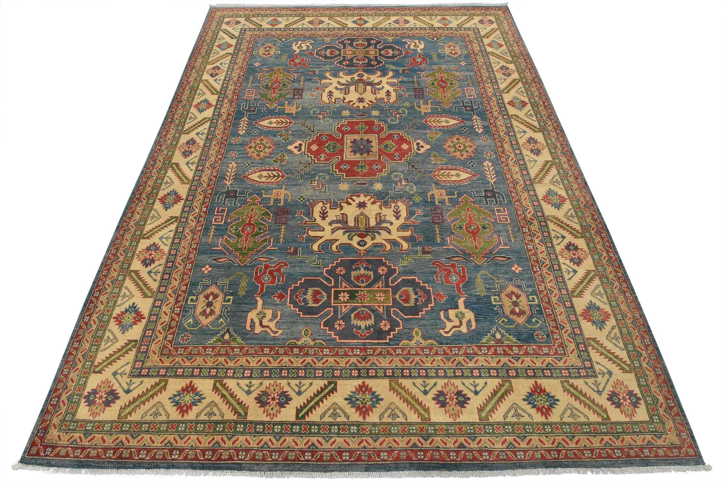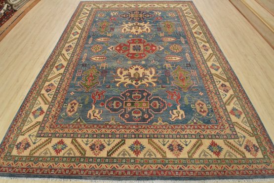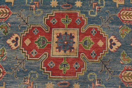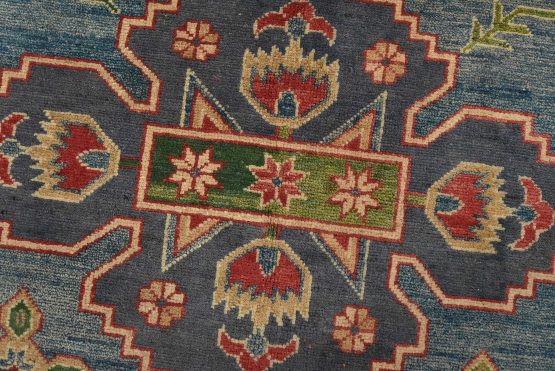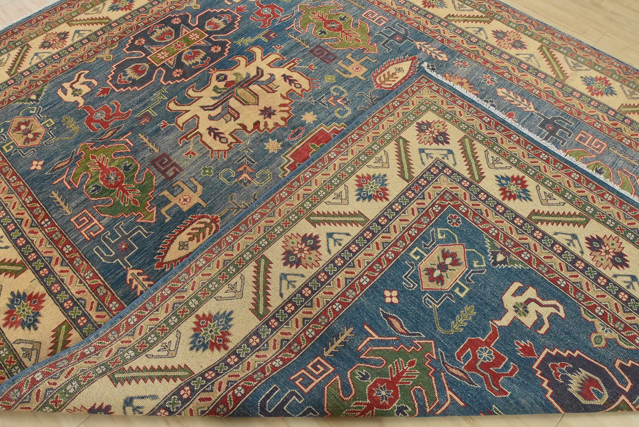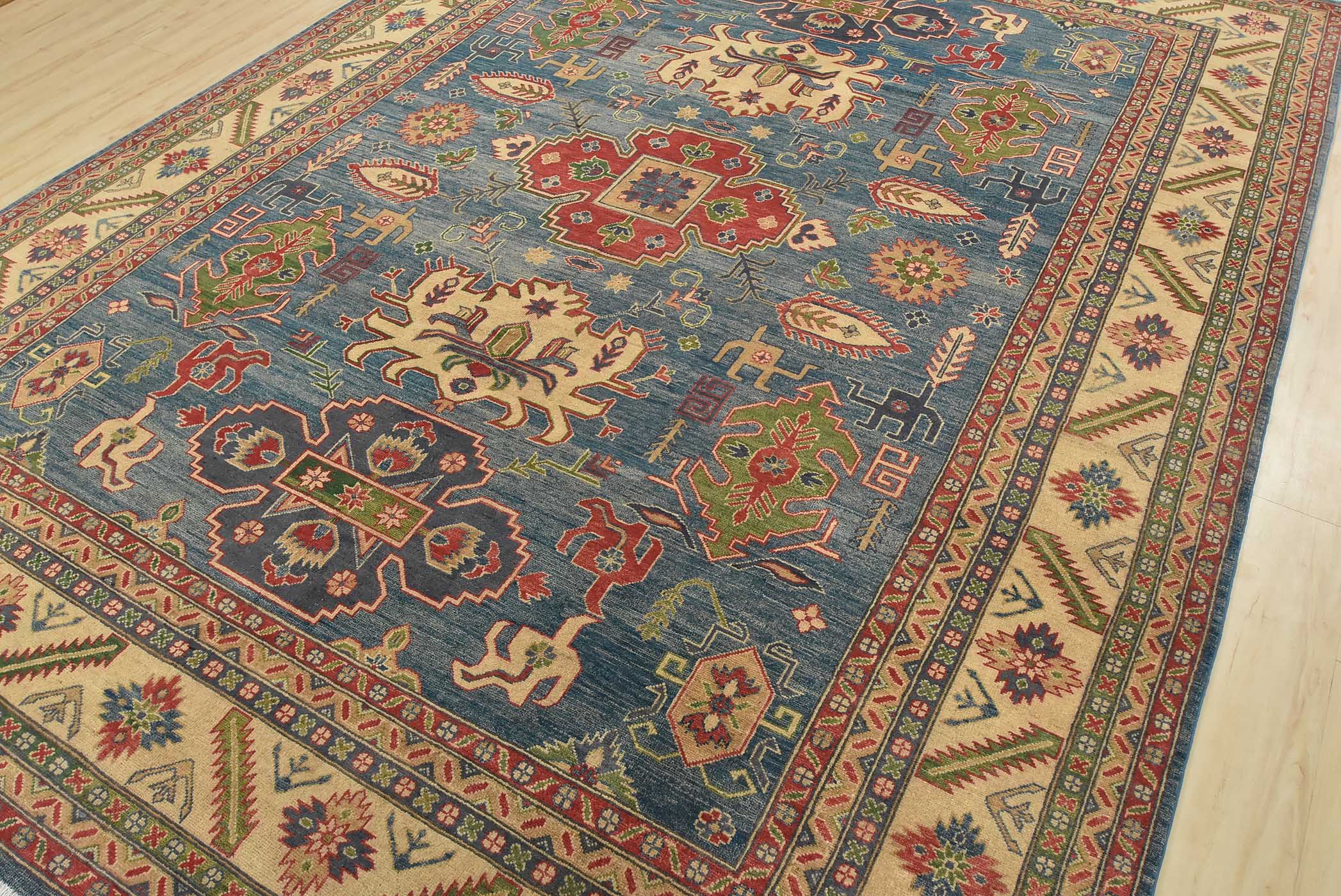 A tribal Caucasian Kazak rug hand-knotted with fine wool on a cotton foundation. This oriental rug features a central medallion surrounded by geometric motifs set against a blue background. It is new and in excellent condition.