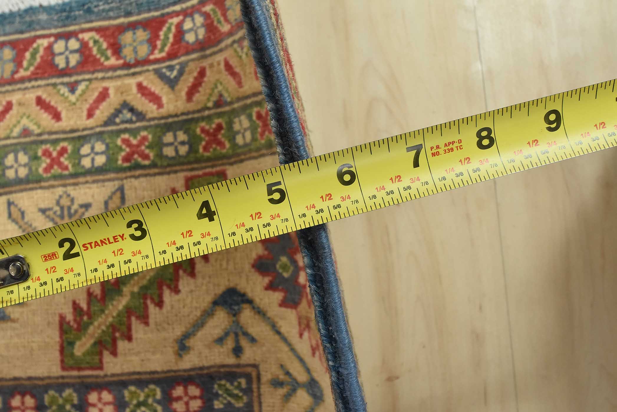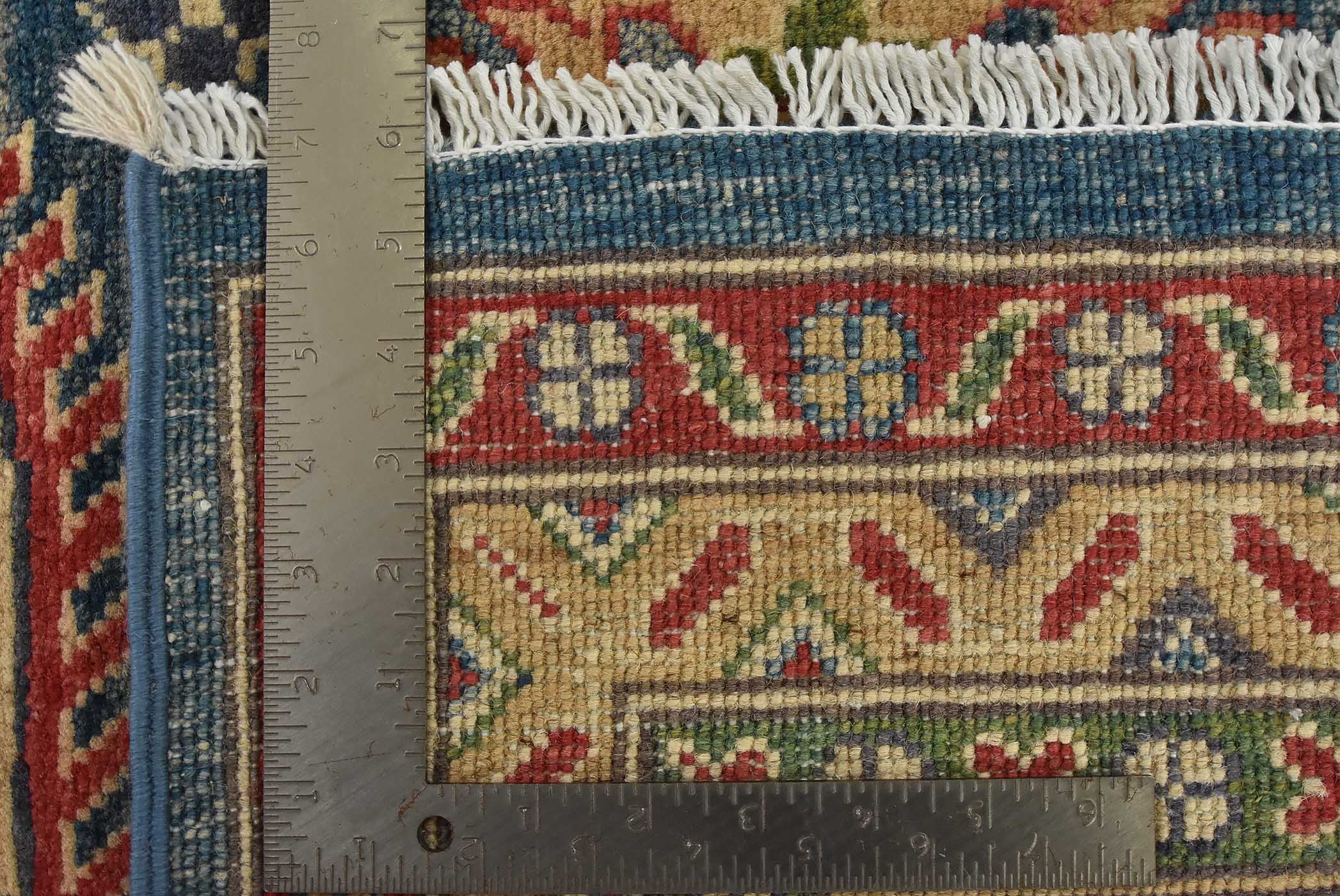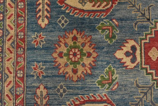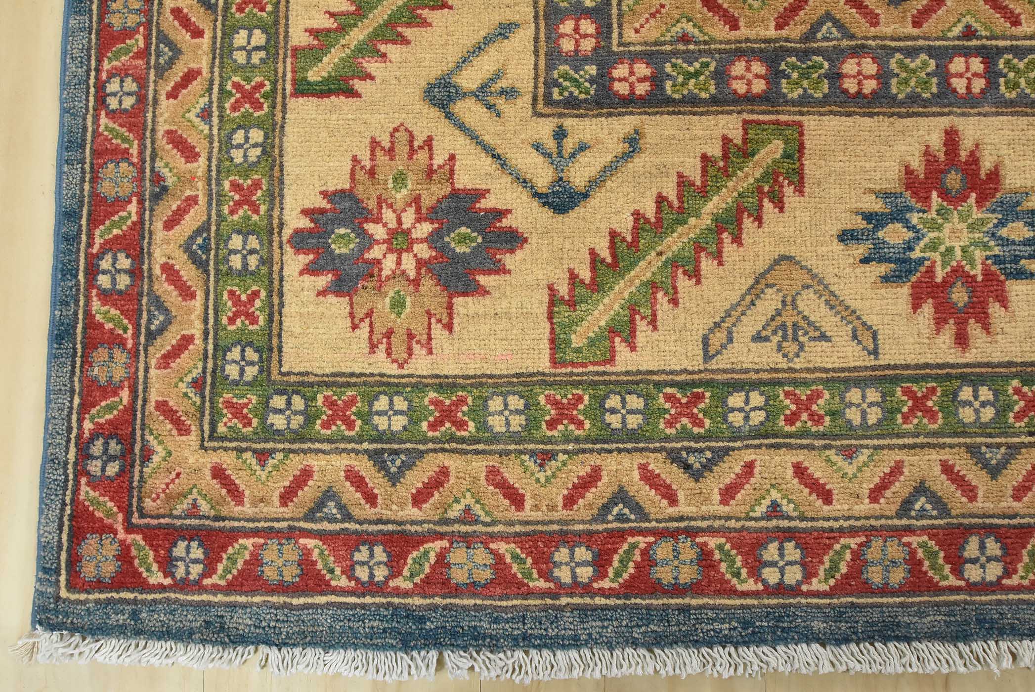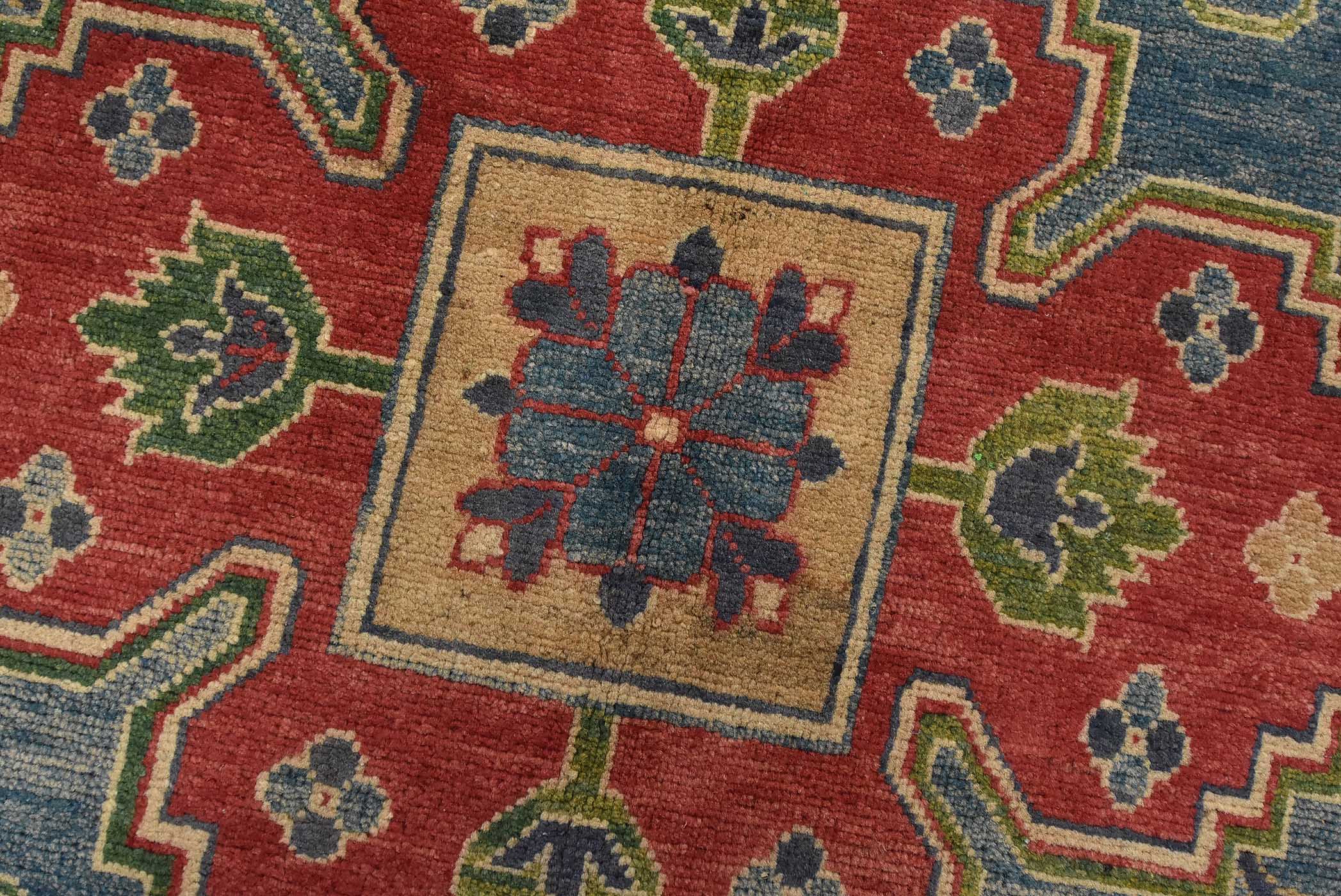 A tribal Caucasian Kazak rug hand-knotted with fine wool on a cotton foundation. This oriental rug features a central medallion surrounded by geometric motifs set against a blue background. It is new and in excellent condition.