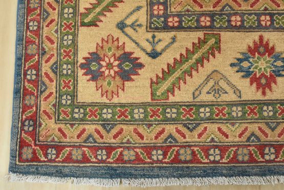 Original antique Kazak rugs from the Caucasus region inspire the creation of new Kazak rugs. These rugs are woven with fine wool using traditional Kazak patterns and finished with a low-cut pile to give them an authentic vintage look.
