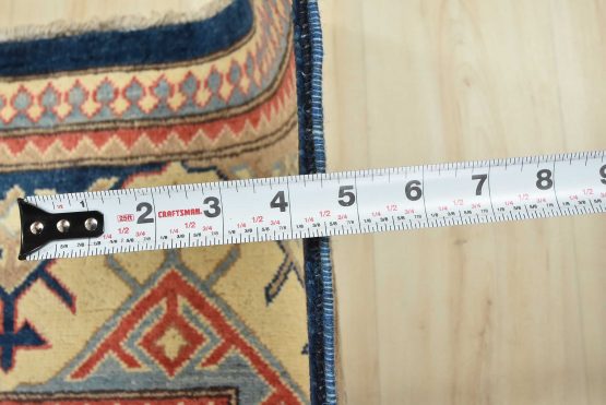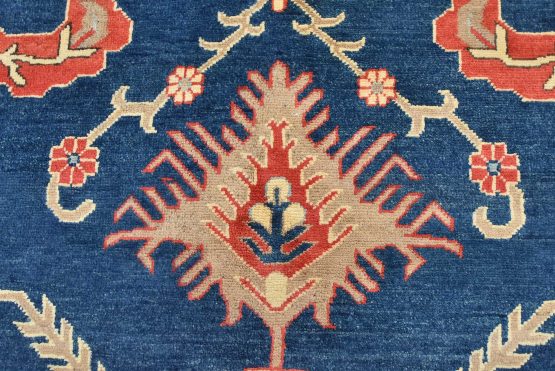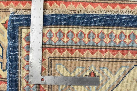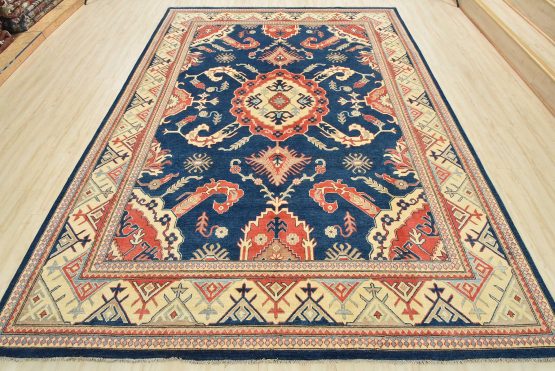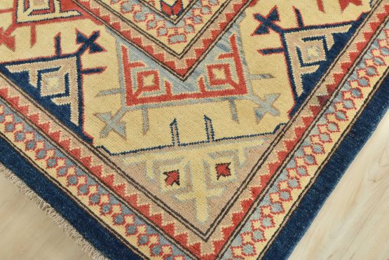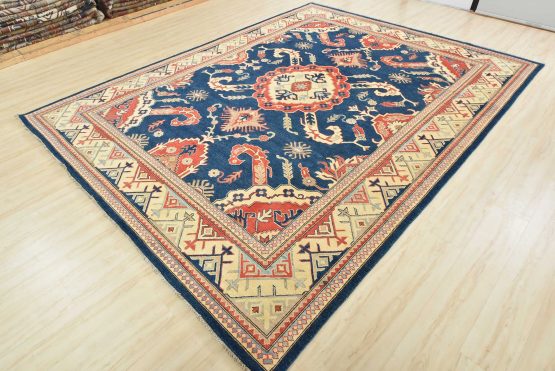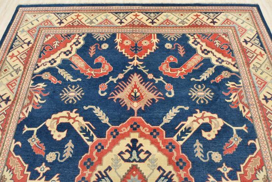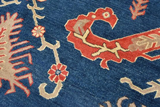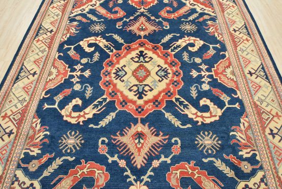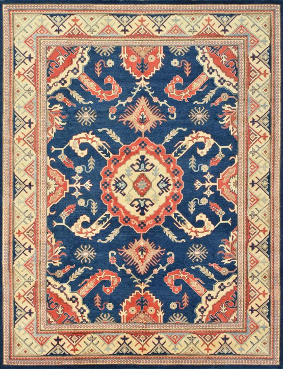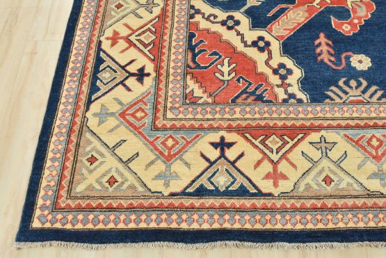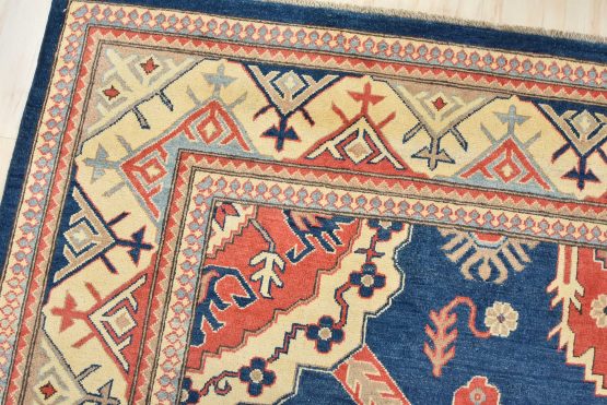 A traditional Kazak rug hand-knotted with an all-wool pile on a cotton foundation. This oriental features a central medallion surrounded by botanical motifs set against a blue background. It is new and in excellent condition.