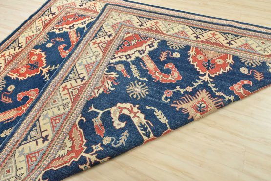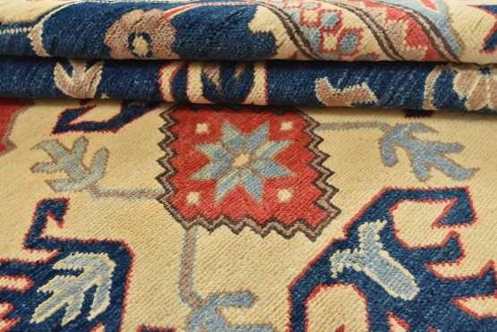 Original antique Kazak rugs from the Caucasus region inspire the creation of new Kazak rugs. These rugs are woven with fine wool using traditional Kazak patterns and finished with a low-cut pile, giving them an authentic vintage look.