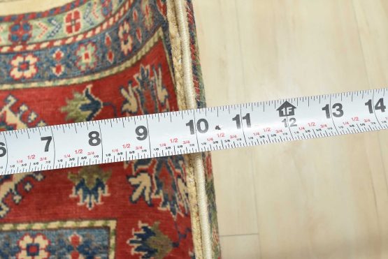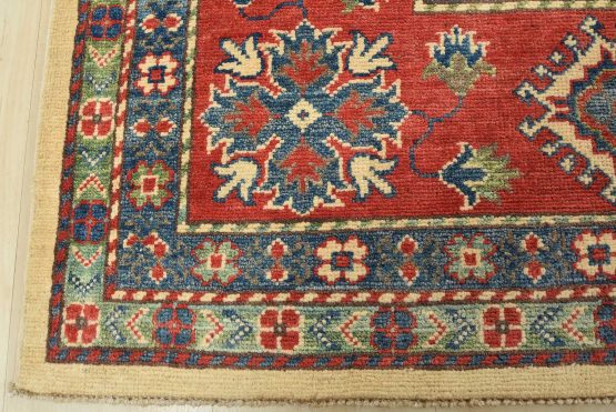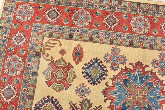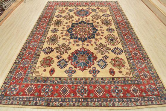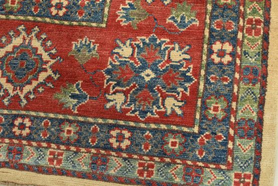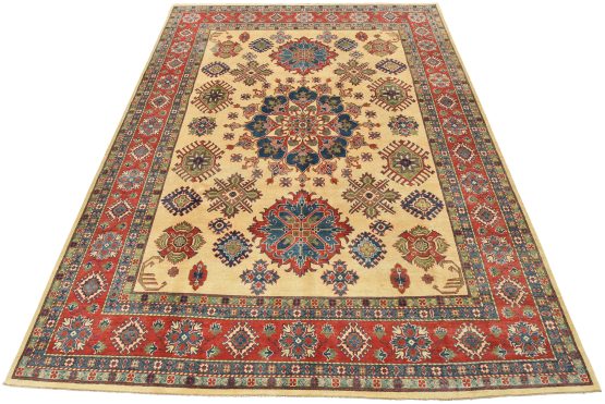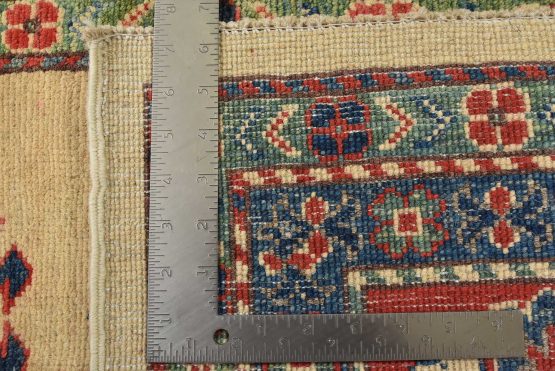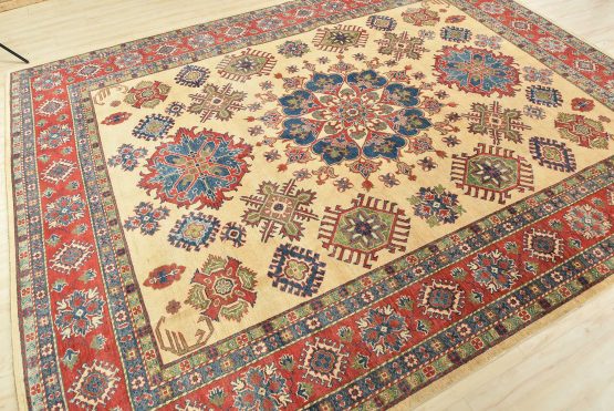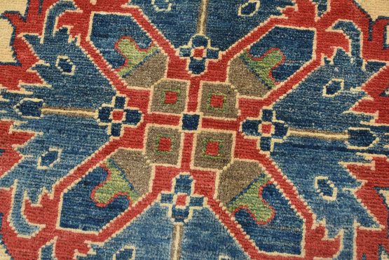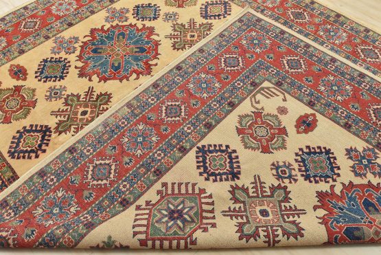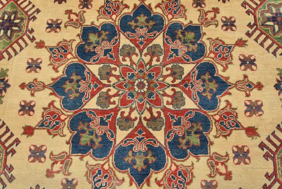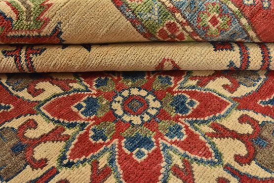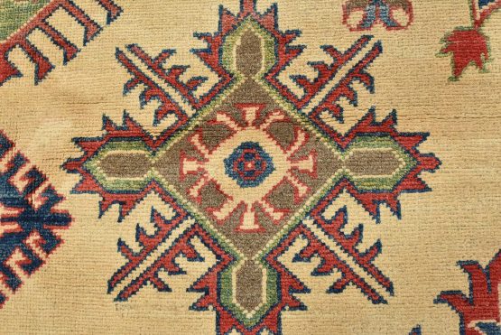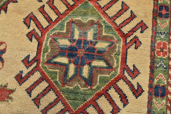 A traditional tribal Caucasian Kazak rug hand-knotted with an all-wool pile on a cotton foundation. This oriental rug features a central medallion surrounded by geometric motifs set against a beige background. It is new and in excellent condition.