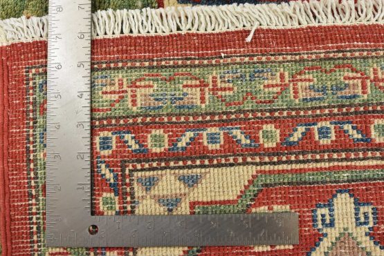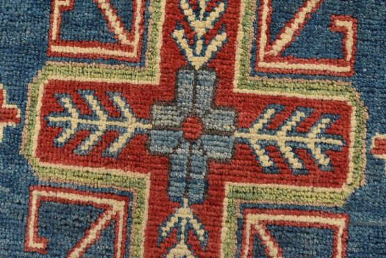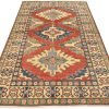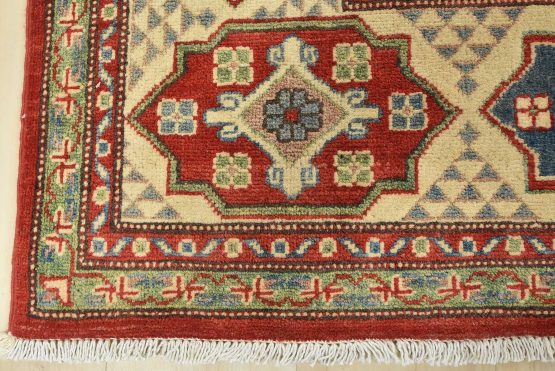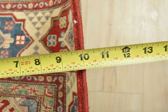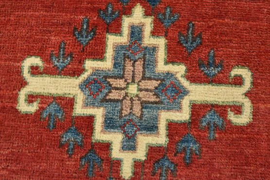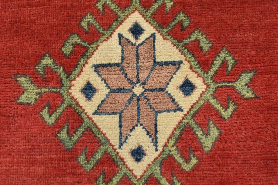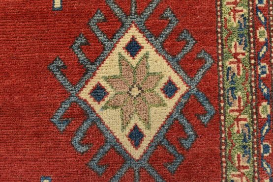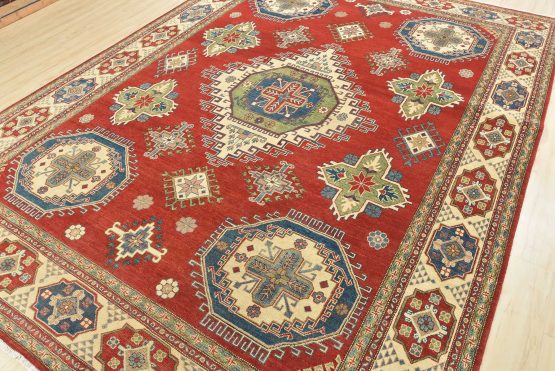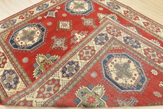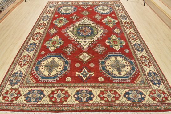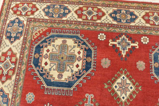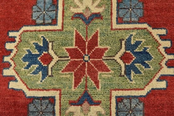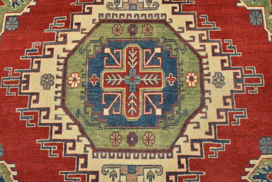 A tribal Caucasian Kazak rug hand-knotted with an all-wool pile on a cotton foundation. This oriental rug features geometric medallions surrounded by geometric motifs set against a red background. It is new and in excellent condition.