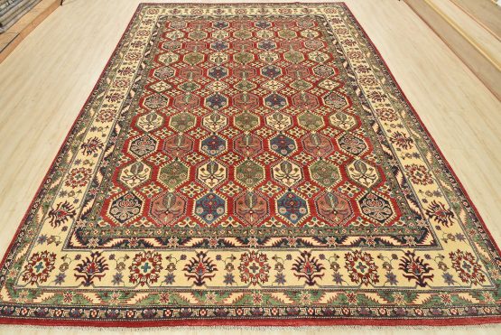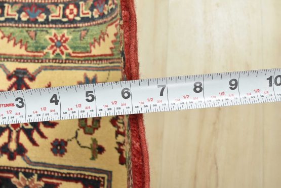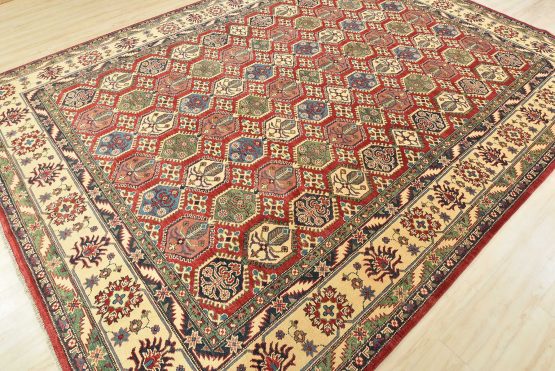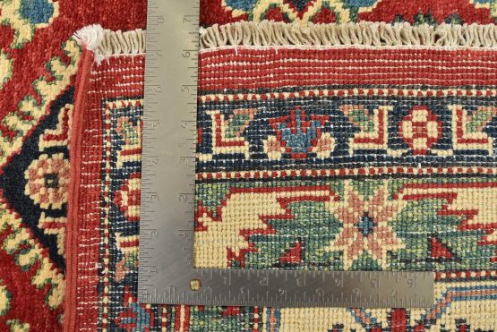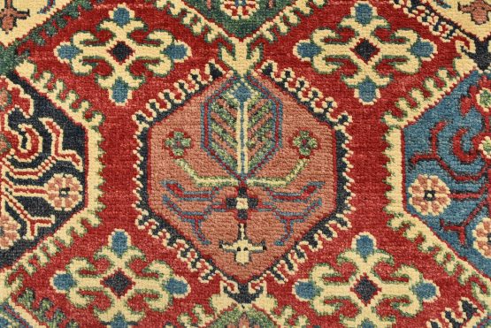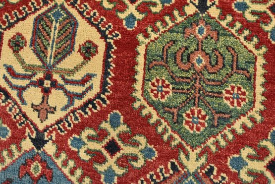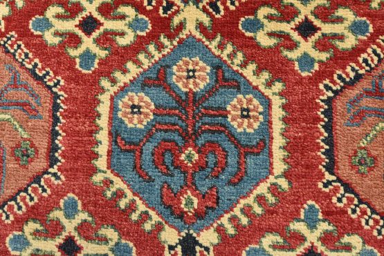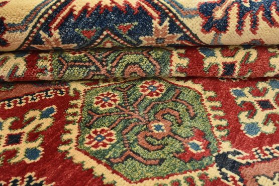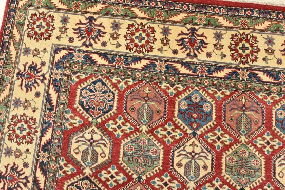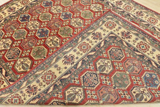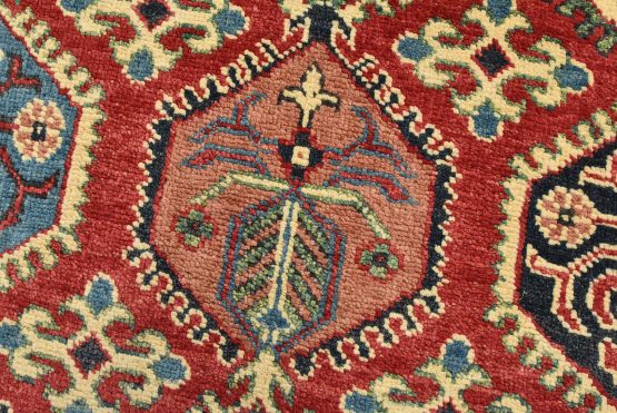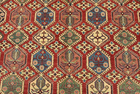 A traditional tribal Caucasian Kazak rug hand-knotted with an all-wool pile on a cotton foundation. This oriental rug features rows of small geometric medallions set against a red background. It is new and in excellent condition.