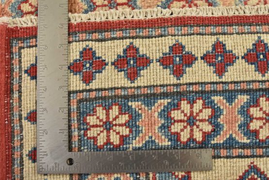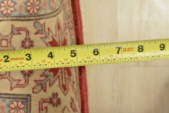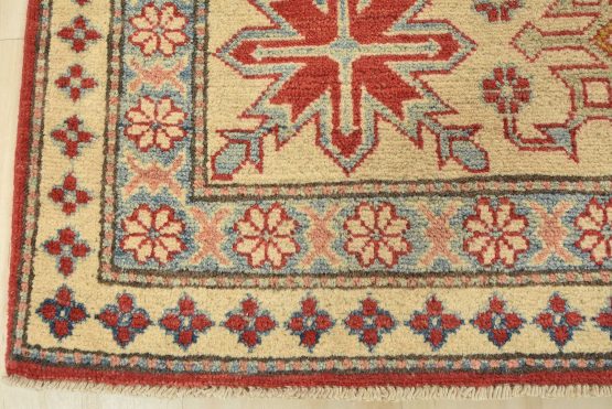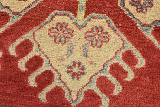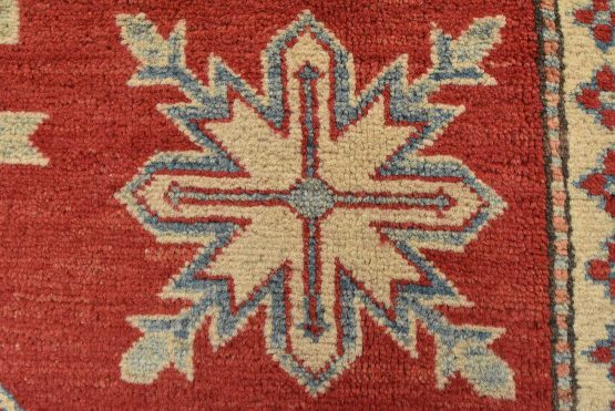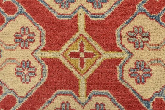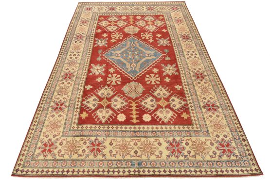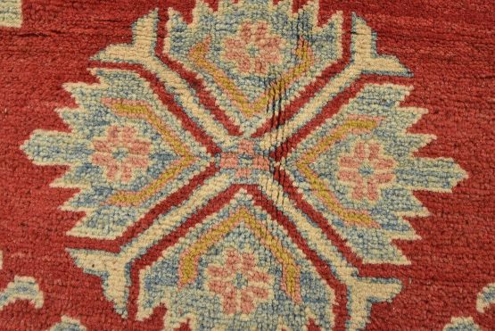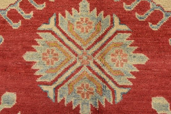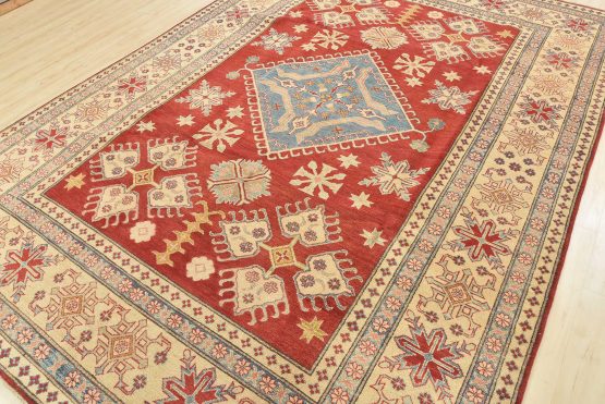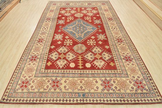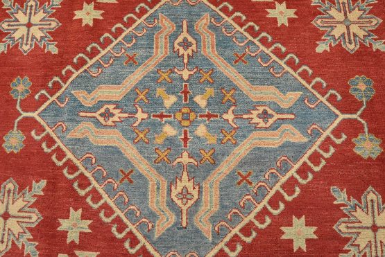 A tribal Caucasian Kazak rug hand-knotted with an all-wool pile on a cotton foundation. This oriental rug features a diamond-shaped medallion surrounded by geometric motifs set against a red background. It is new and in excellent condition.