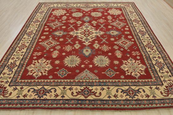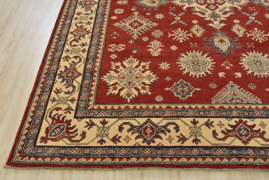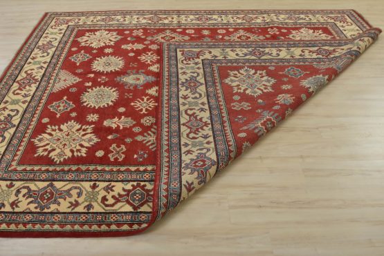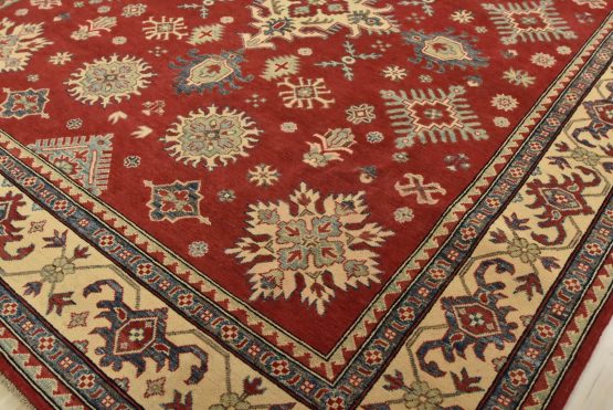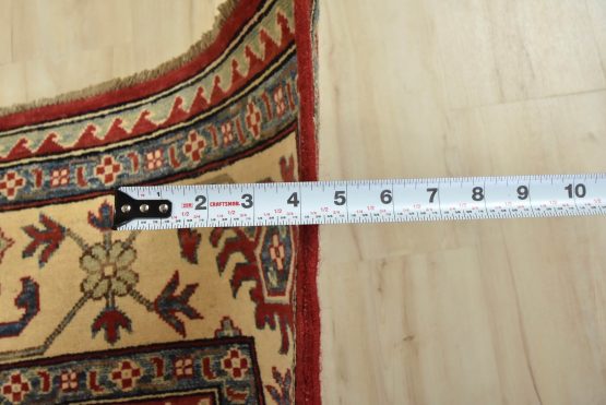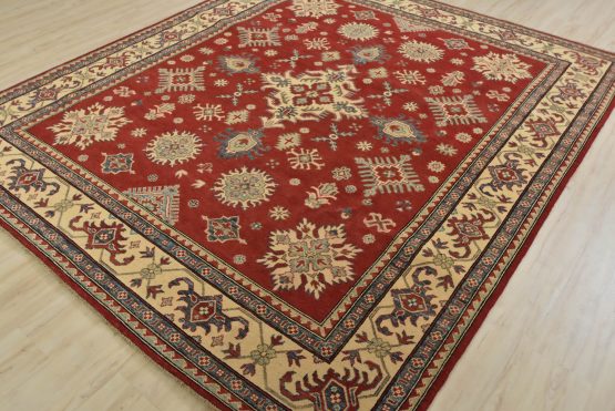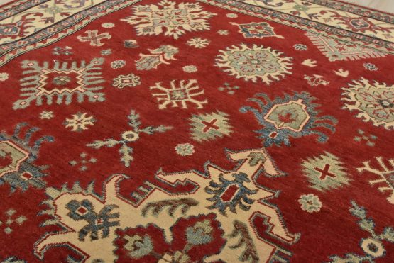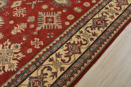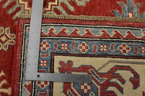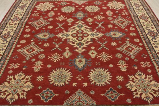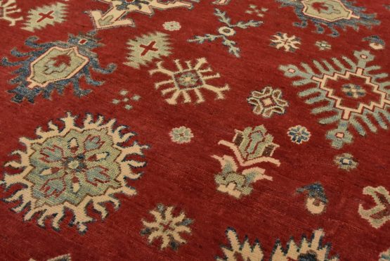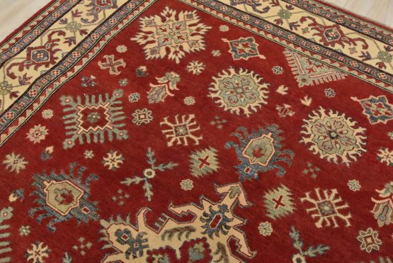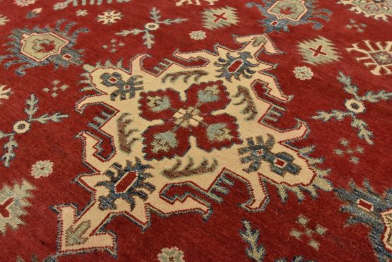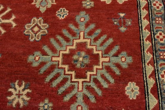 A tribal Kazak rug hand-knotted with an all-wool pile on a cotton foundation. This oriental rug features a central geometric medallion surrounded by geometric motifs set against a red background. It is new and in excellent condition.