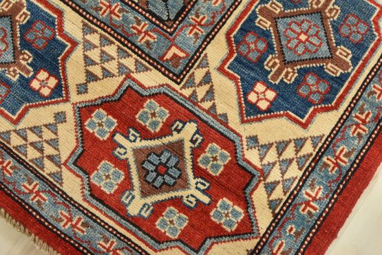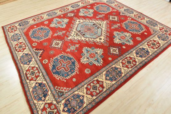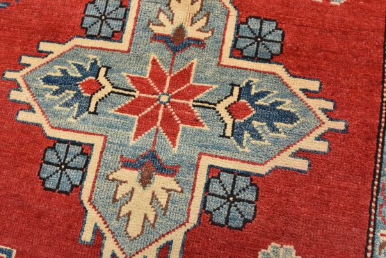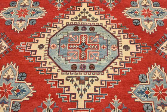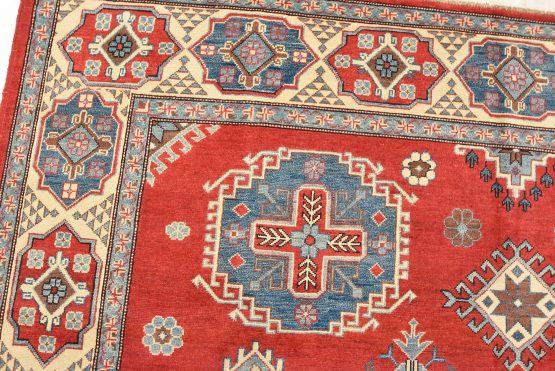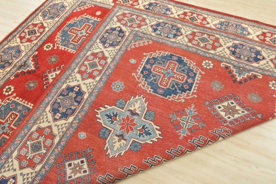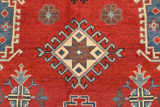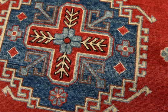 A tribal Caucasian Kazak rug hand-knotted with an all-wool pile on a cotton foundation. This oriental rug features geometric medallions surrounded by geometric motifs set against a red background. It is new and in excellent condition.