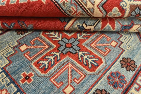 Original antique Kazak rugs from the Caucasus region inspire the creation of new Kazak rugs. These rugs are woven with fine wool using traditional Kazak patterns and finished with a low-cut pile to give them an authentic vintage look.