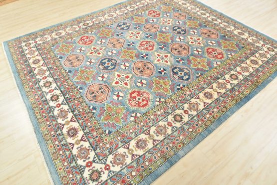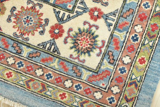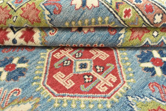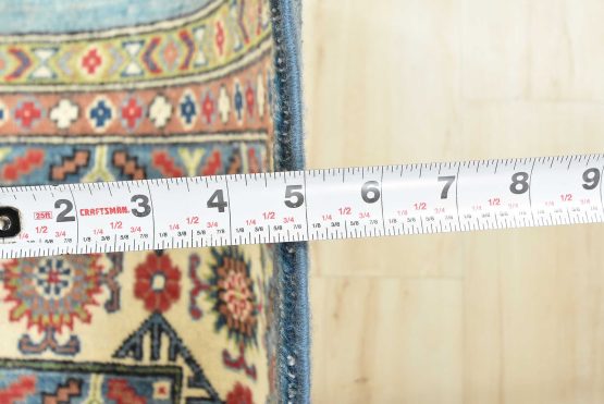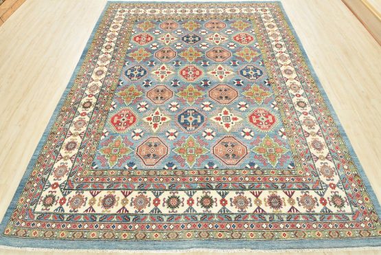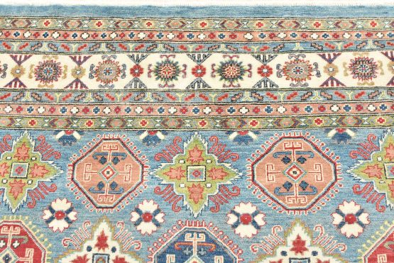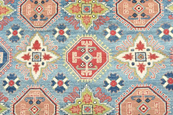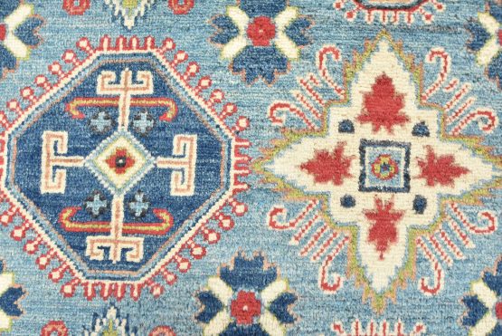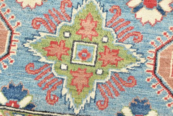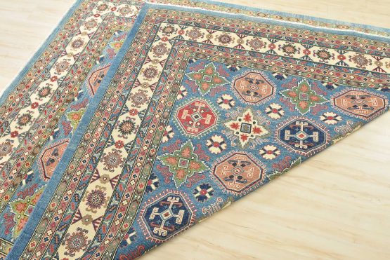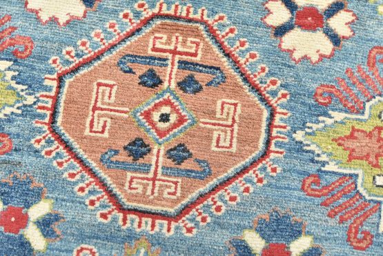 A traditional tribal Caucasian Kazak rug hand-knotted with an all-wool pile on a cotton foundation. This oriental rug features rows of geometric motifs set against a blue background. It is new and in excellent condition.