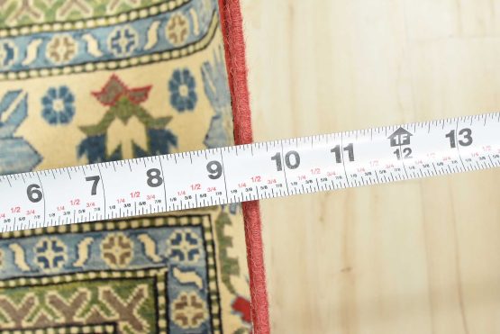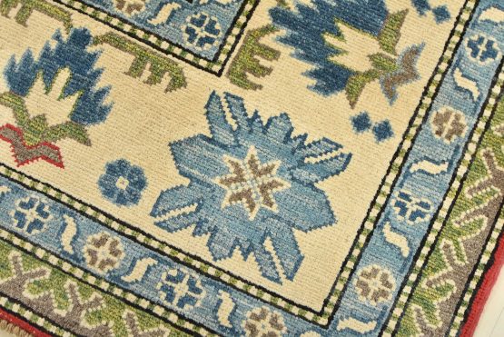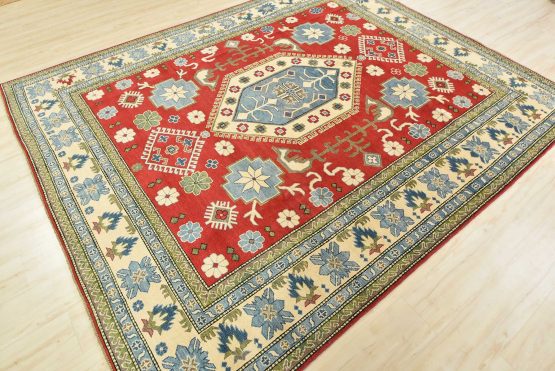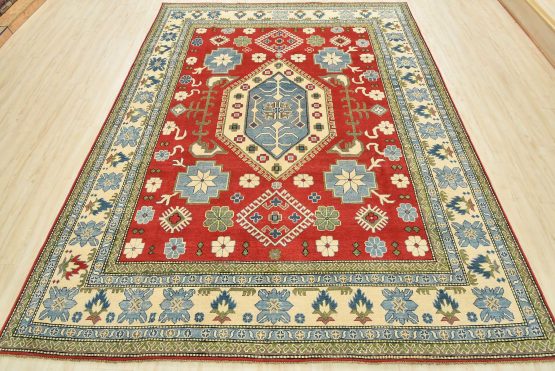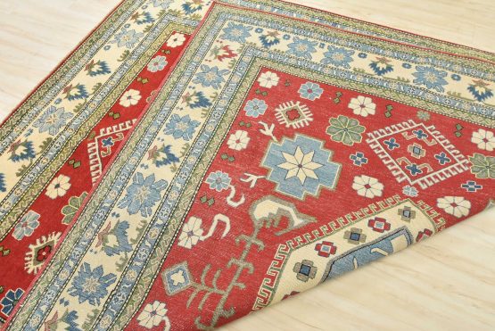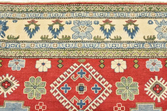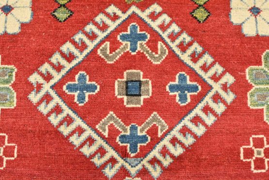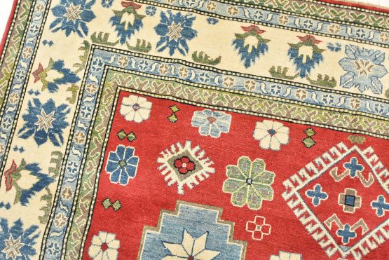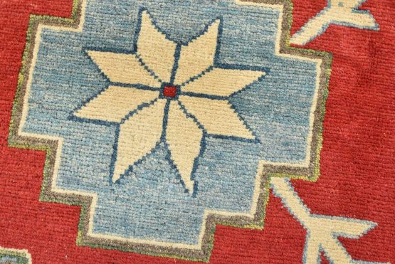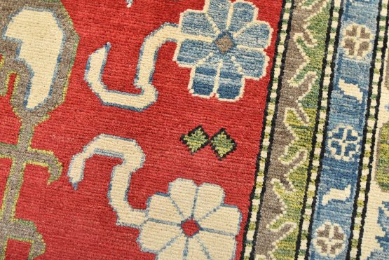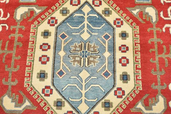 A tribal Caucasian Kazak rug hand-knotted with an all-wool pile on a cotton foundation. This oriental rug features a central geometric medallion surrounded by geometric flowers and motifs. It is new and in excellent condition.