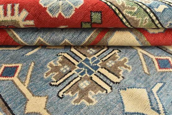 Original antique Kazak rugs from the Caucasus region inspire the creation of new Kazak rugs. These rugs are woven with fine wool using traditional Kazak patterns and finished with a low-cut pile to give them an authentic vintage look.