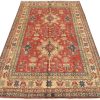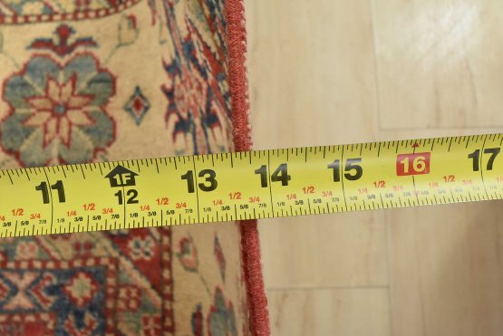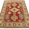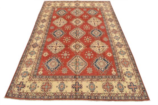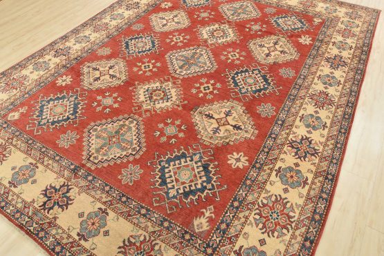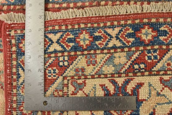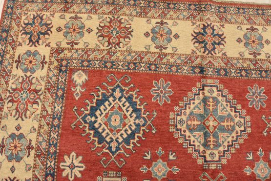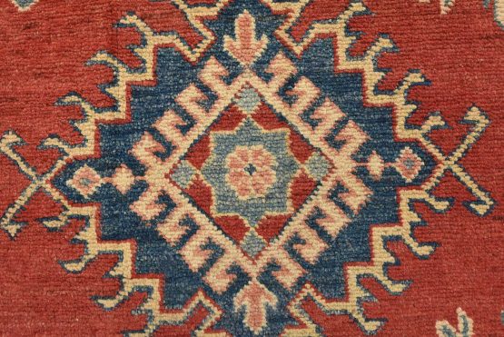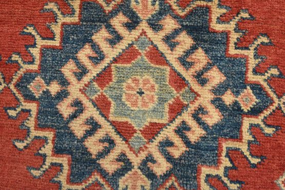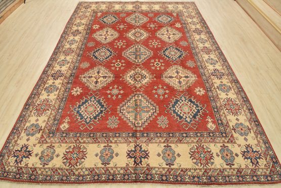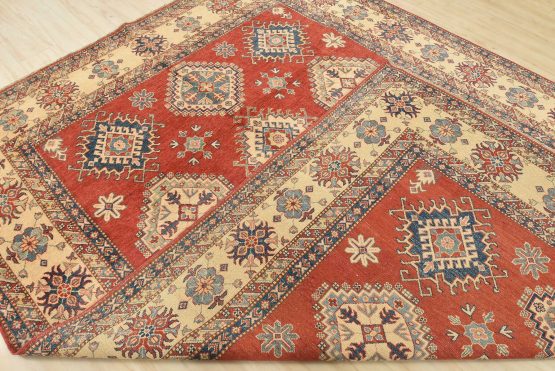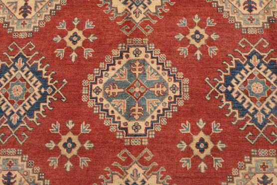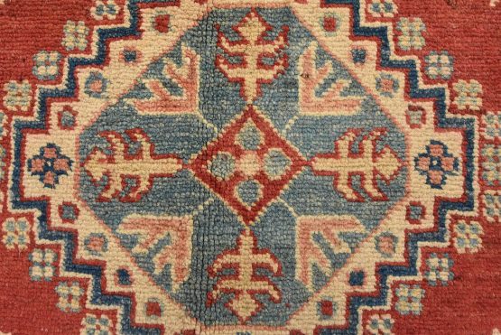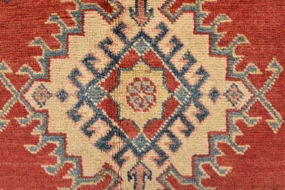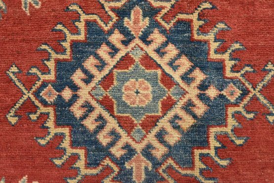 A tribal Caucasian Kazak rug hand-knotted with an all-wool pile on a cotton foundation. This oriental rug features rows of geometric medallions set against a red background. It is new and in excellent condition.
