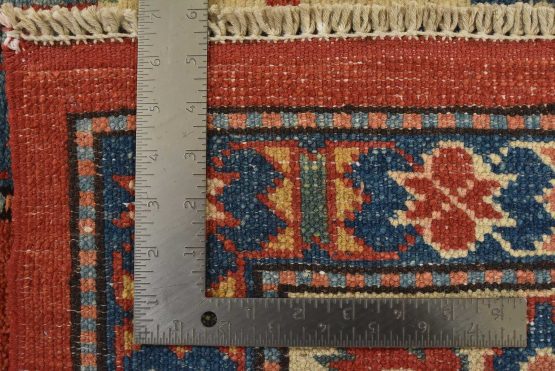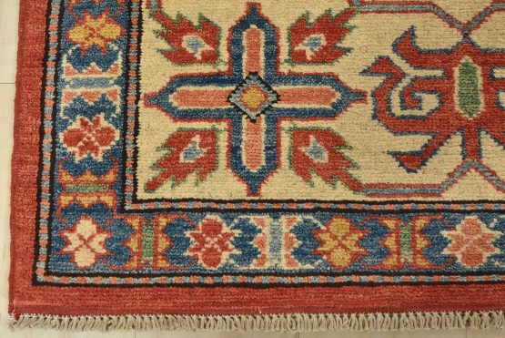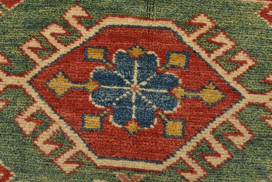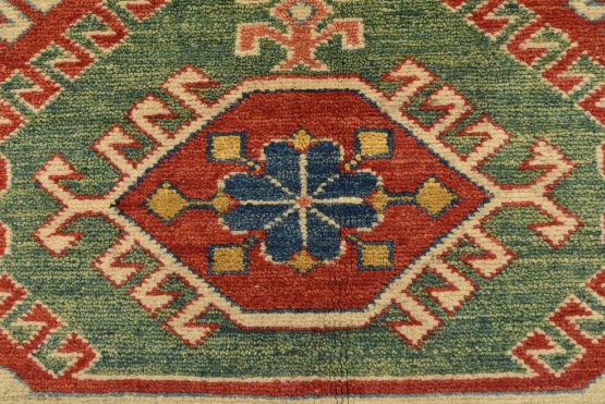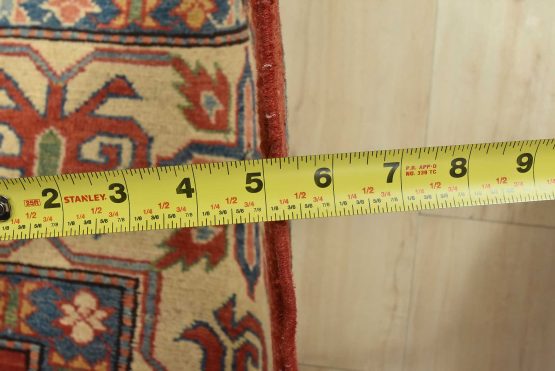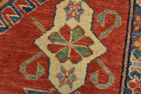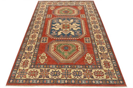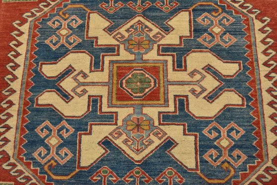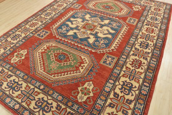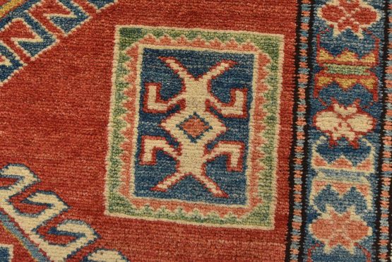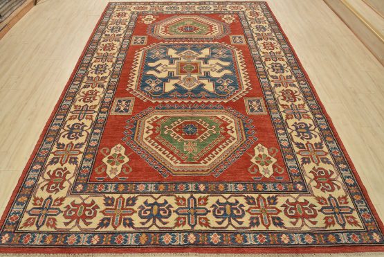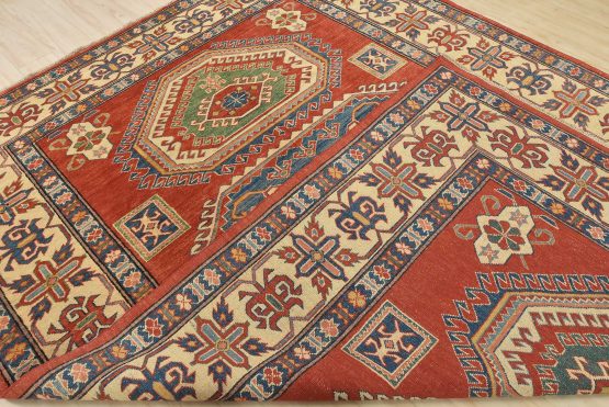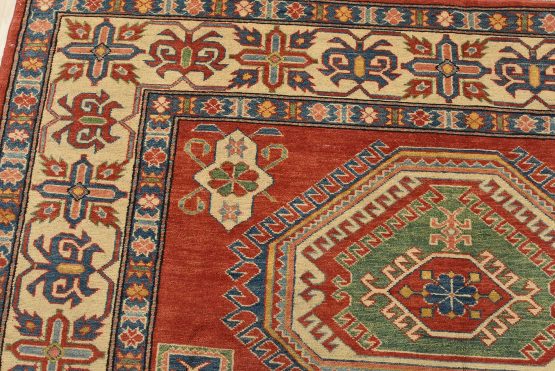 A tribal Caucasian Kazak rug hand-knotted with an all-wool pile on a cotton foundation. This oriental rug features geometric medallions surrounded by geometric motifs set against a red background. It is new and in excellent condition.
