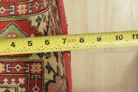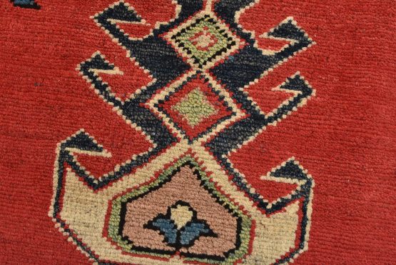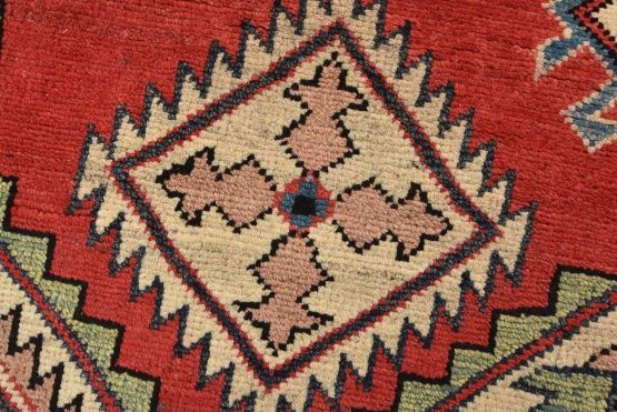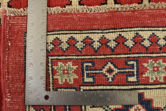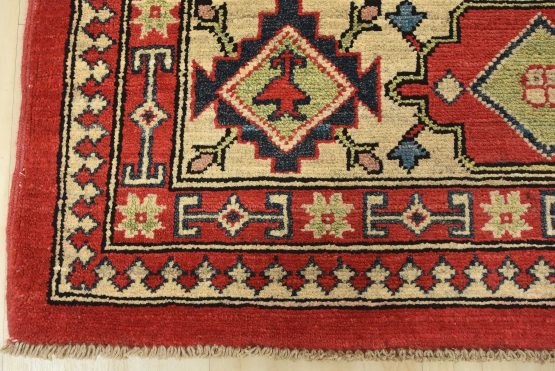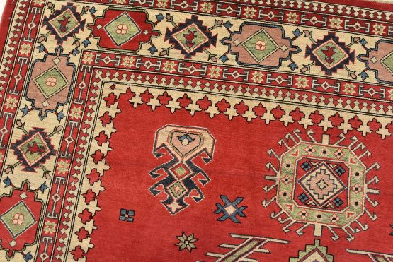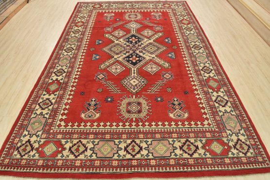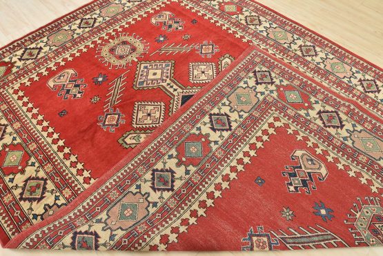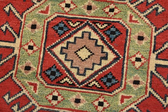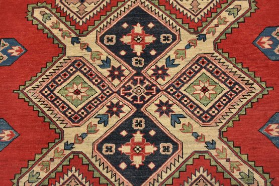 A tribal Caucasian Kazak rug hand-knotted with an all-wool pile on a cotton foundation. This oriental rug features a central geometric medallion surrounded by geometric motifs set against a red background. It is new and in excellent condition.