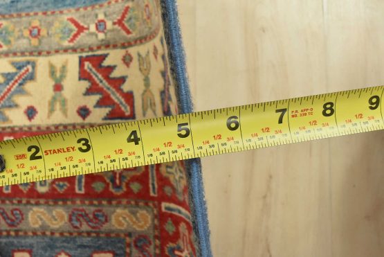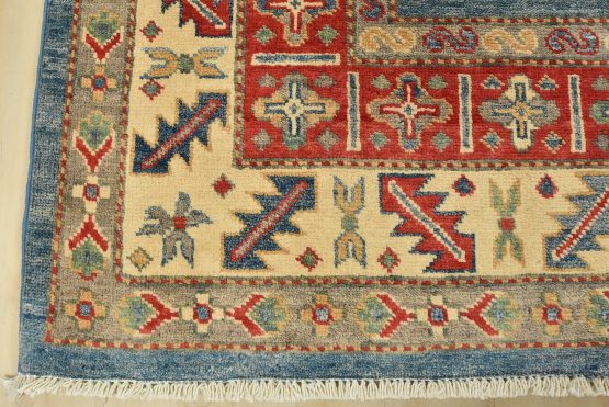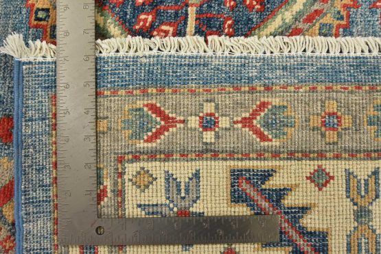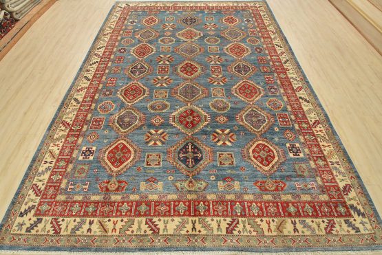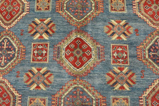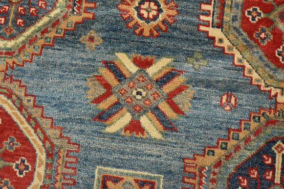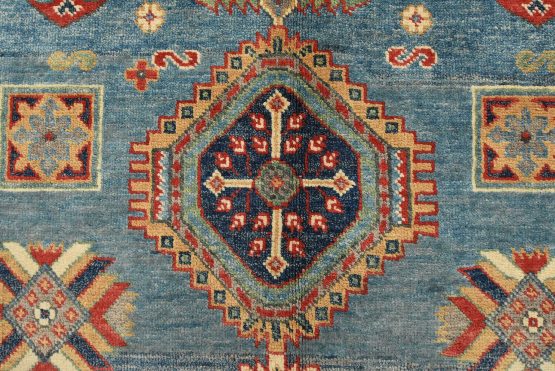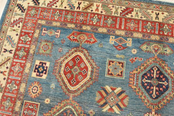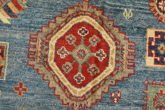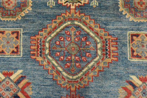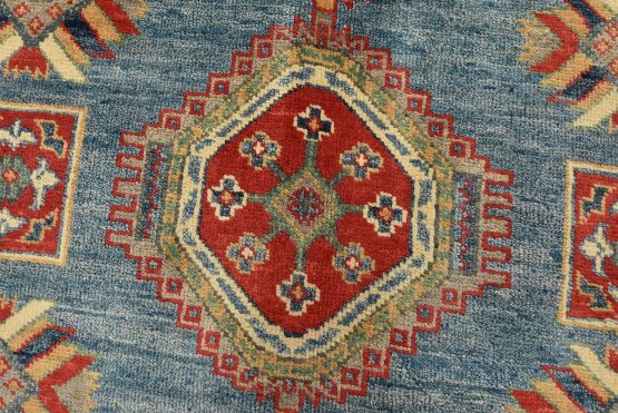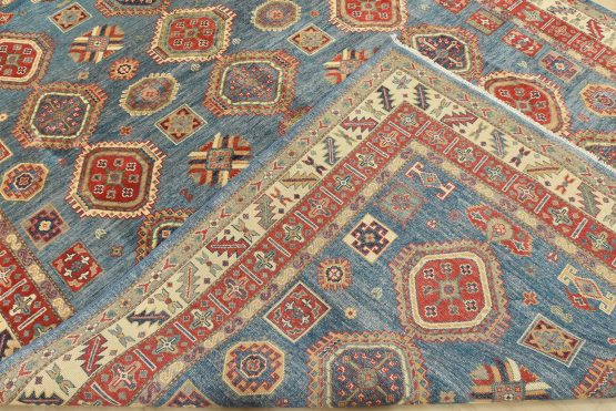 A tribal Caucasian Kazak rug hand-knotted with an all-wool pile on a cotton foundation. This oriental rug features rows of geometric medallions surrounded by geometric motifs set against a blue background. It is new and in excellent condition.