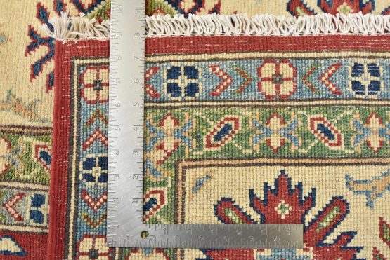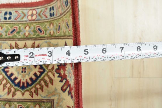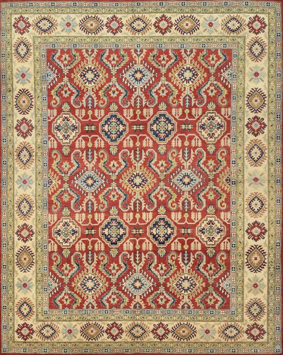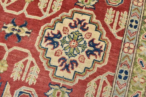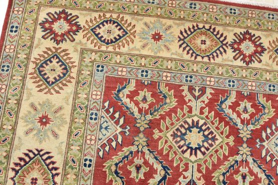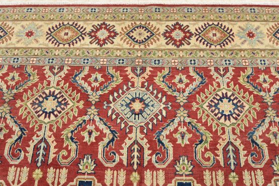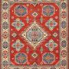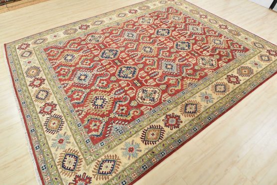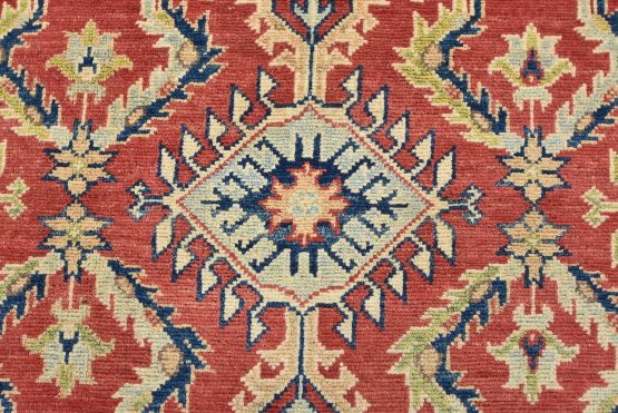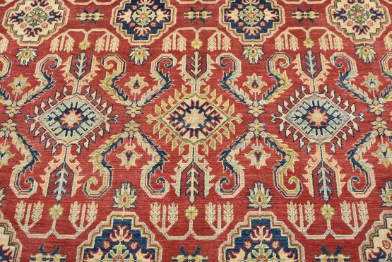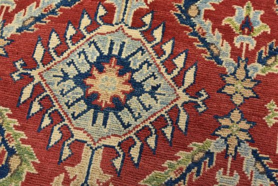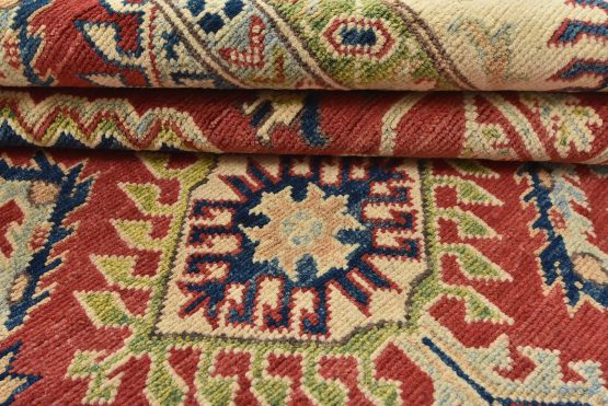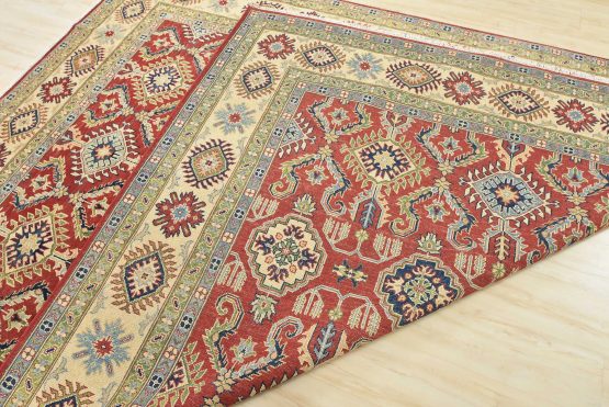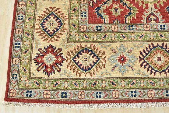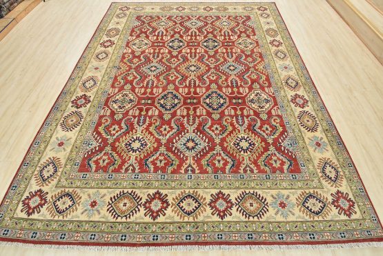 A traditional tribal Caucasian Kazak rug hand-knotted with an all-wool pile on a cotton foundation. This oriental rug features a botanical design with geometric motifs set against a red background. It is new and in excellent condition.