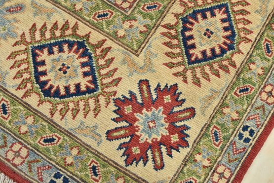 Original antique Kazak rugs from the Caucasus region inspire the creation of new Kazak rugs. These rugs are woven with fine wool using traditional Kazak patterns and finished with a low-cut pile to give them an authentic vintage look.