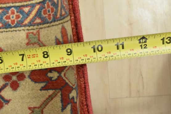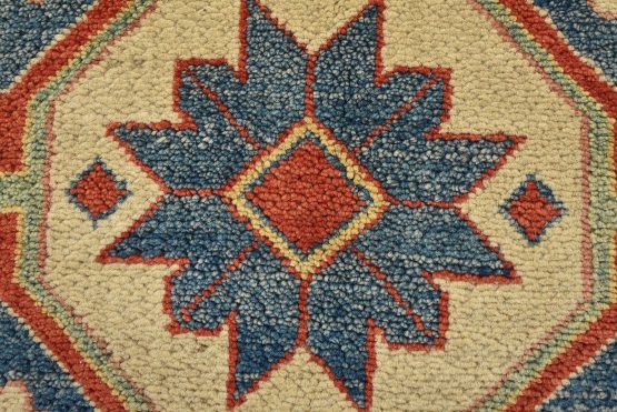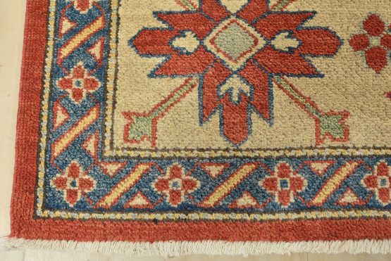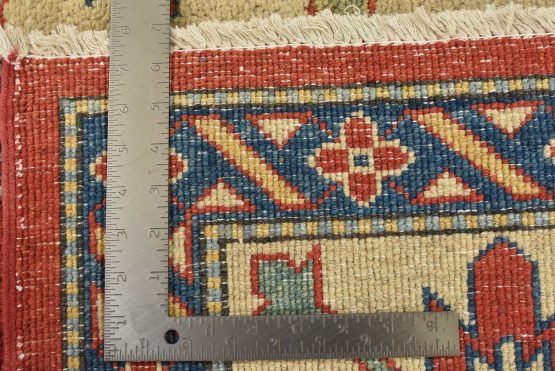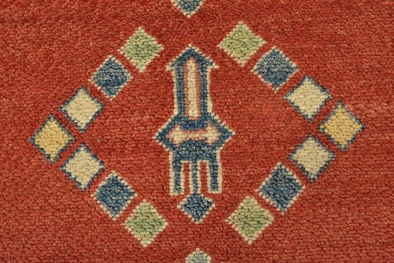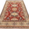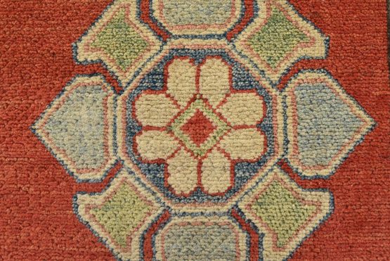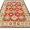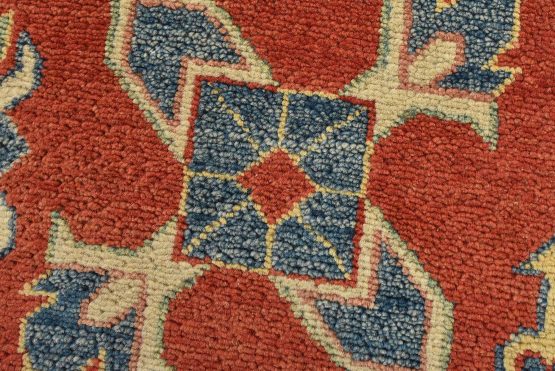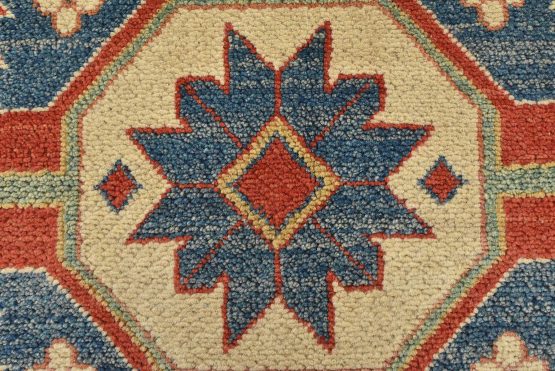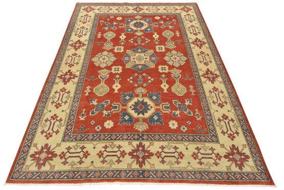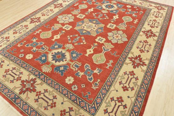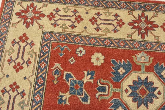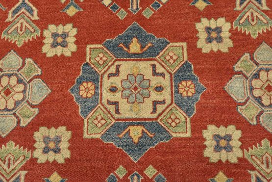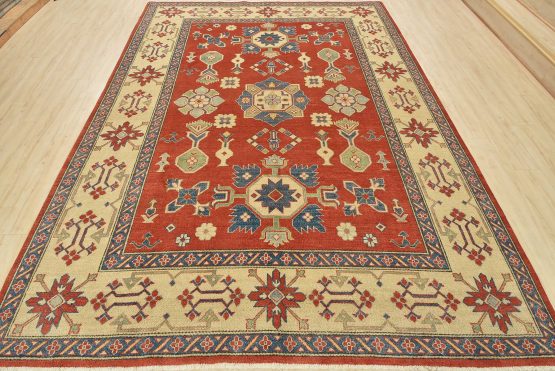 A tribal Caucasian Kazak rug hand-knotted with an all-wool pile on a cotton foundation. This oriental rug features a central geometric medallion surrounded by geometric motifs set against a red background. It is new and in excellent condition.