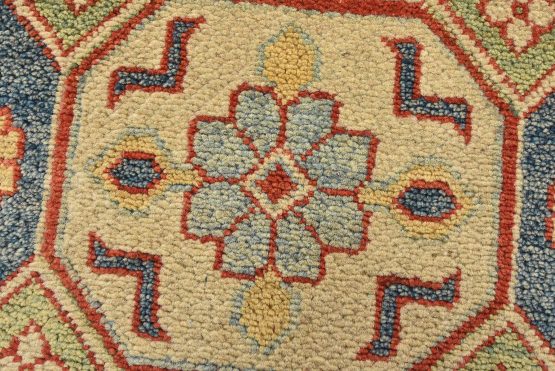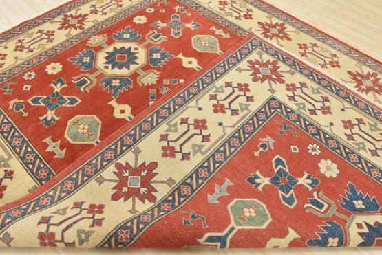 Original antique Kazak rugs from the Caucasus region inspire the creation of new Kazak rugs. These rugs are woven with fine wool using traditional Kazak patterns and finished with a low-cut pile to give them an authentic vintage look.
