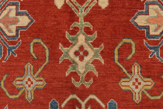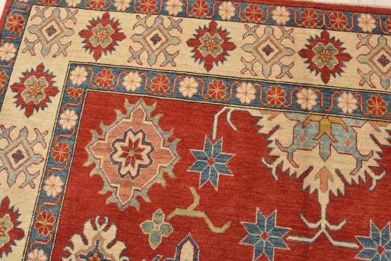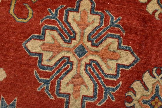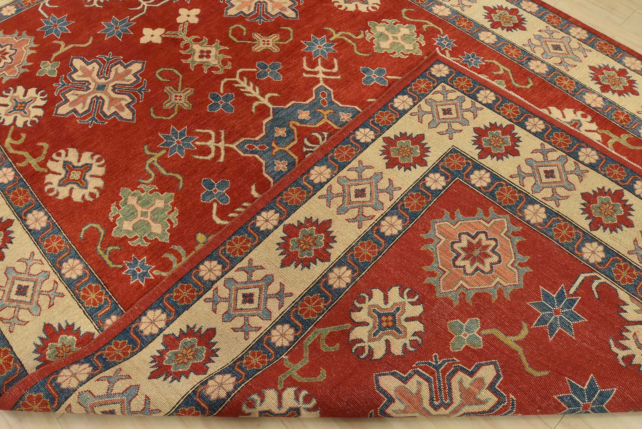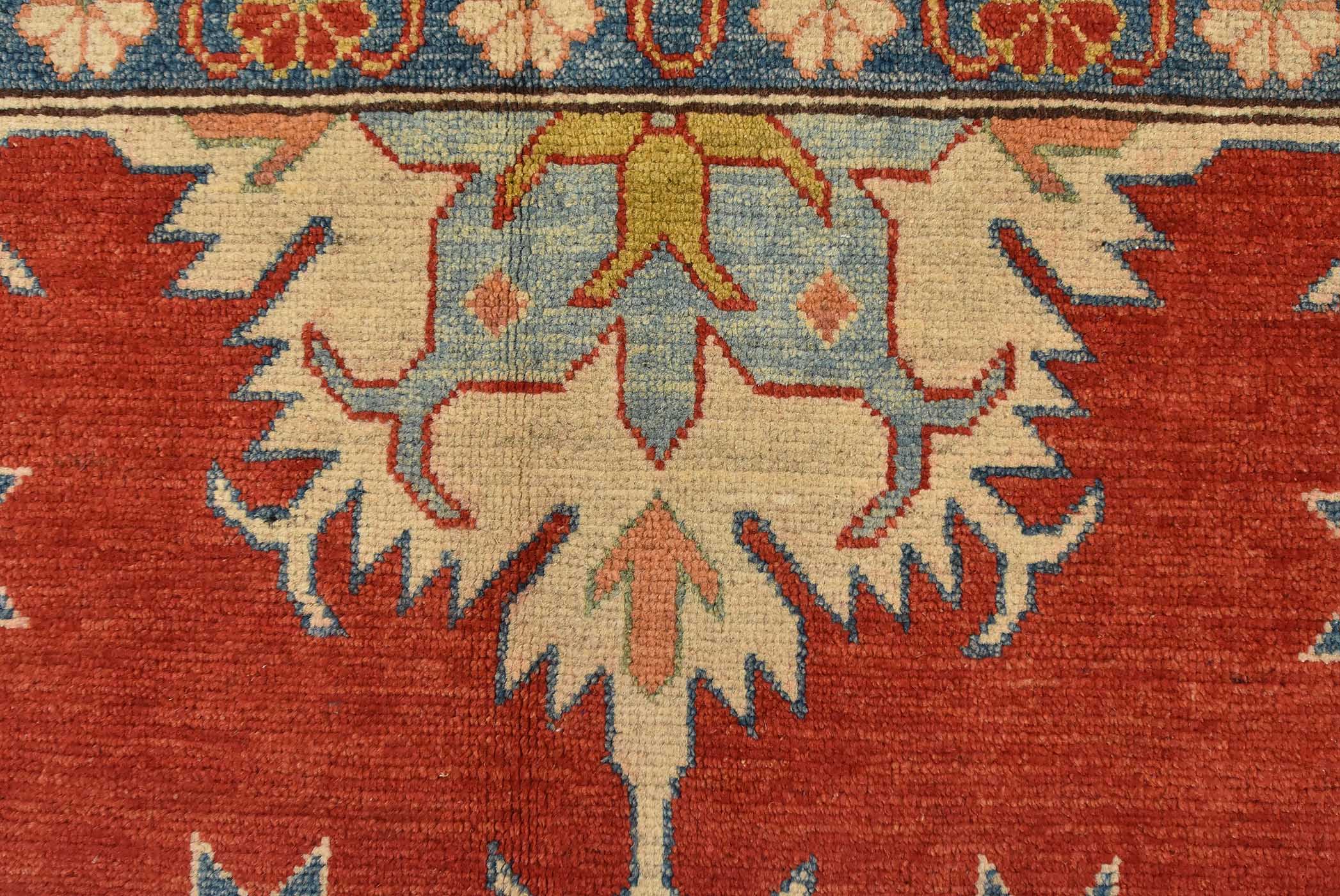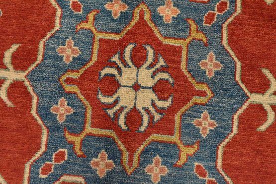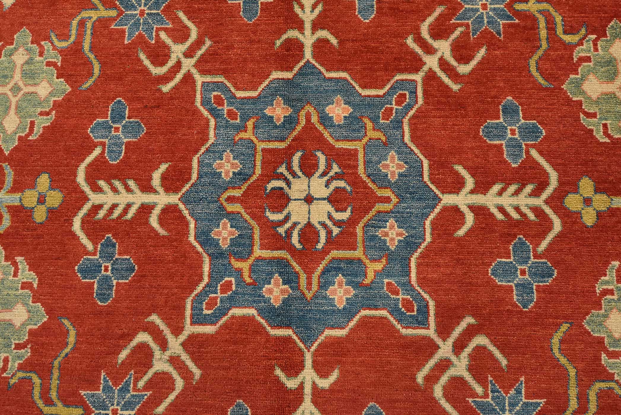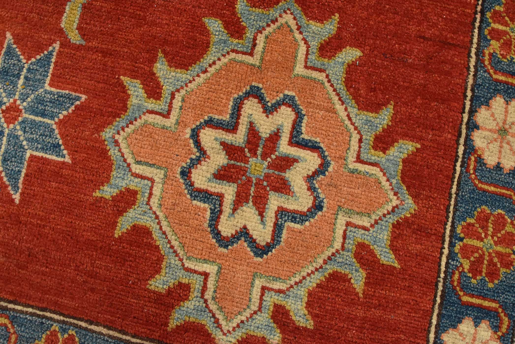 A tribal Caucasian Kazak rug hand-knotted with fine wool on a cotton foundation. This rug features a central medallion surrounded by geometric motifs set against a red background. It is new and in excellent condition.