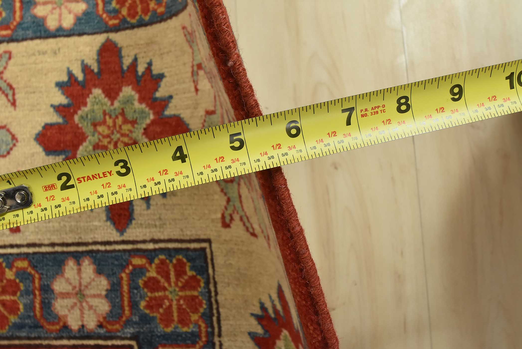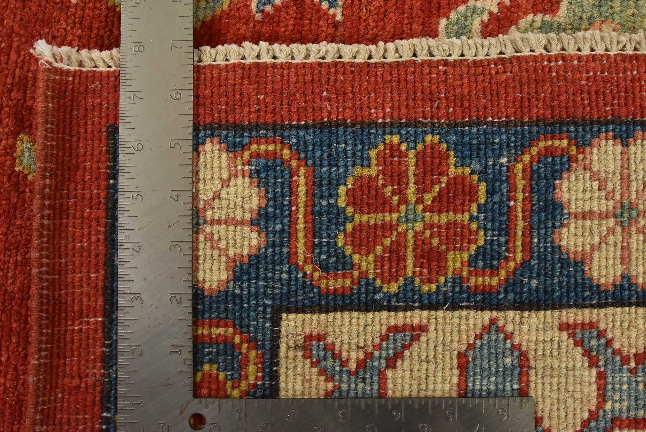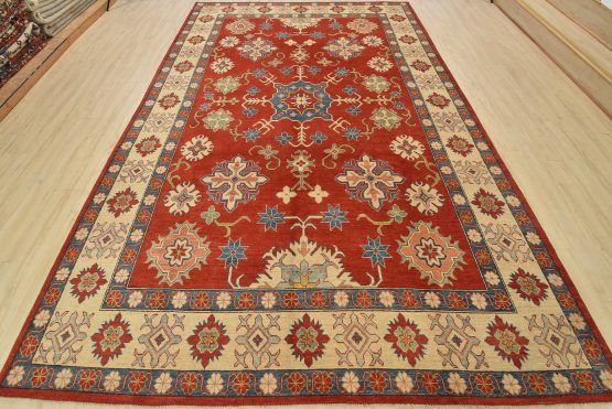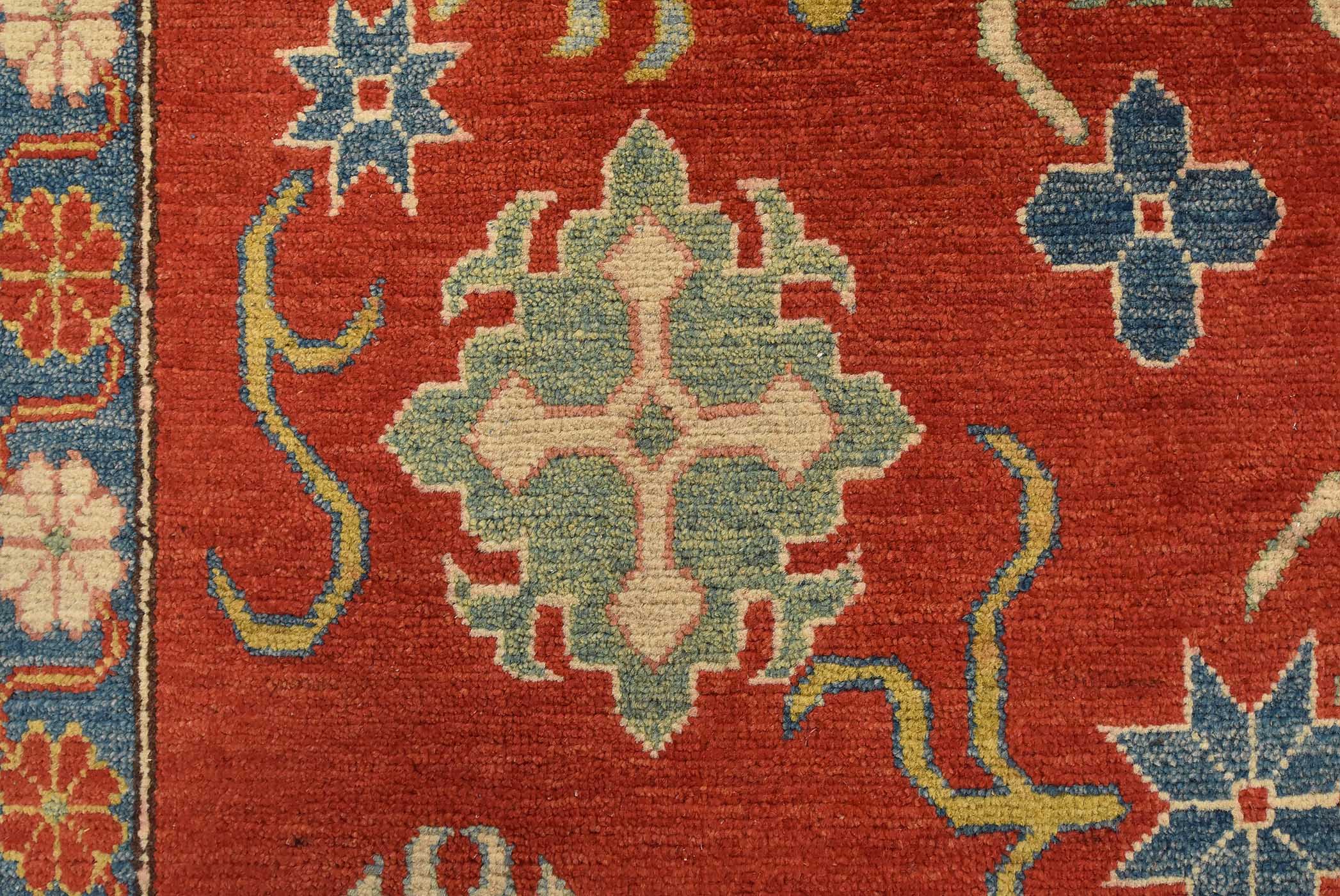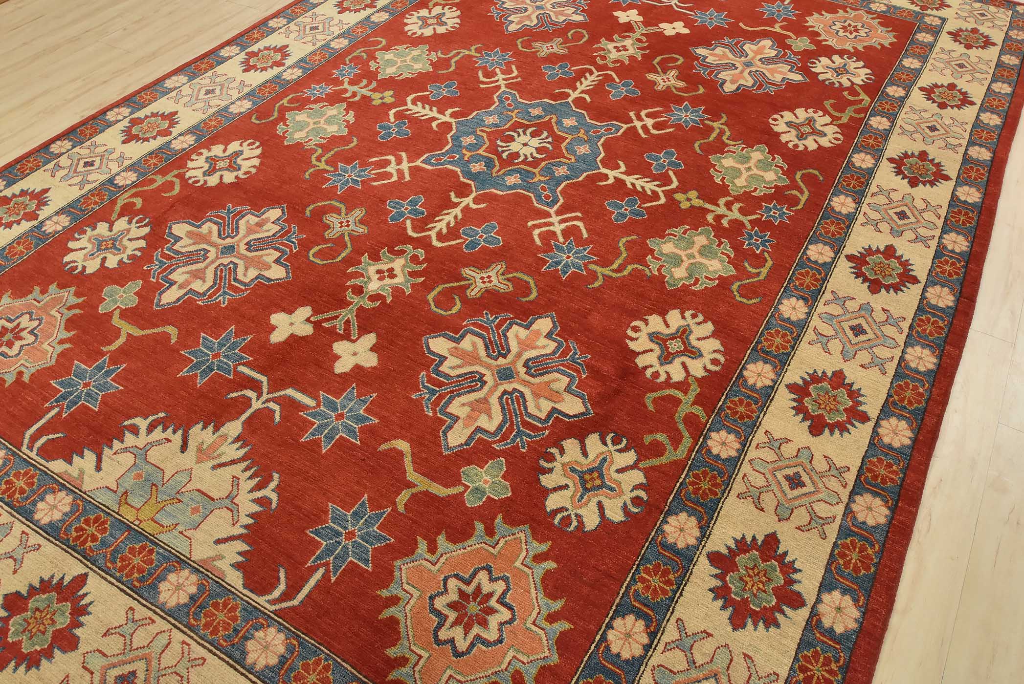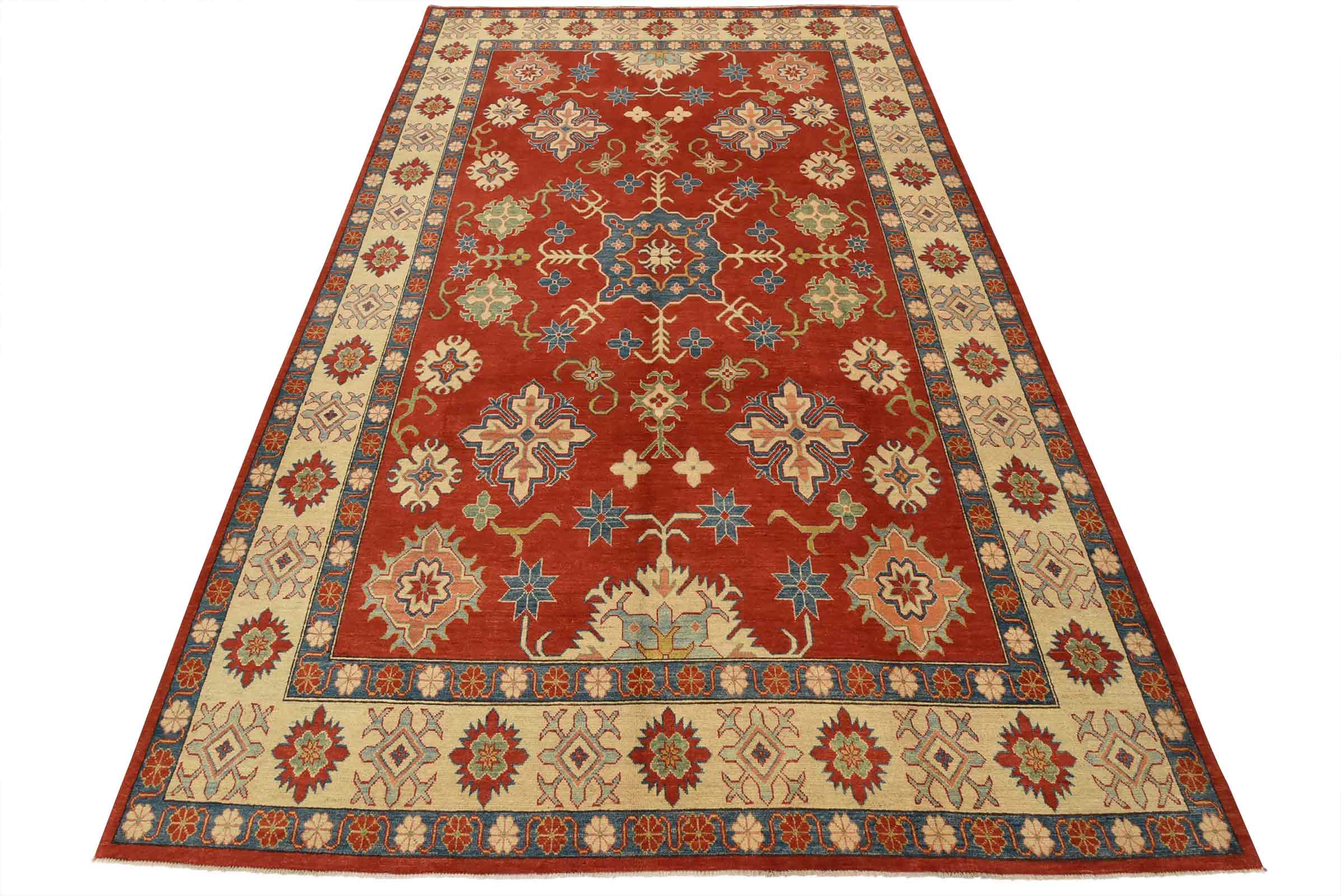 A tribal Caucasian Kazak rug hand-knotted with fine wool on a cotton foundation. This rug features a central medallion surrounded by geometric motifs set against a red background. It is new and in excellent condition.