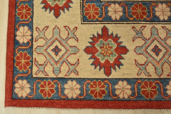 Original antique Kazak rugs from the Caucasus region inspire the creation of new Kazak rugs. These rugs are woven with fine wool using traditional Kazak patterns and finished with a low-cut pile to give them an authentic vintage look.